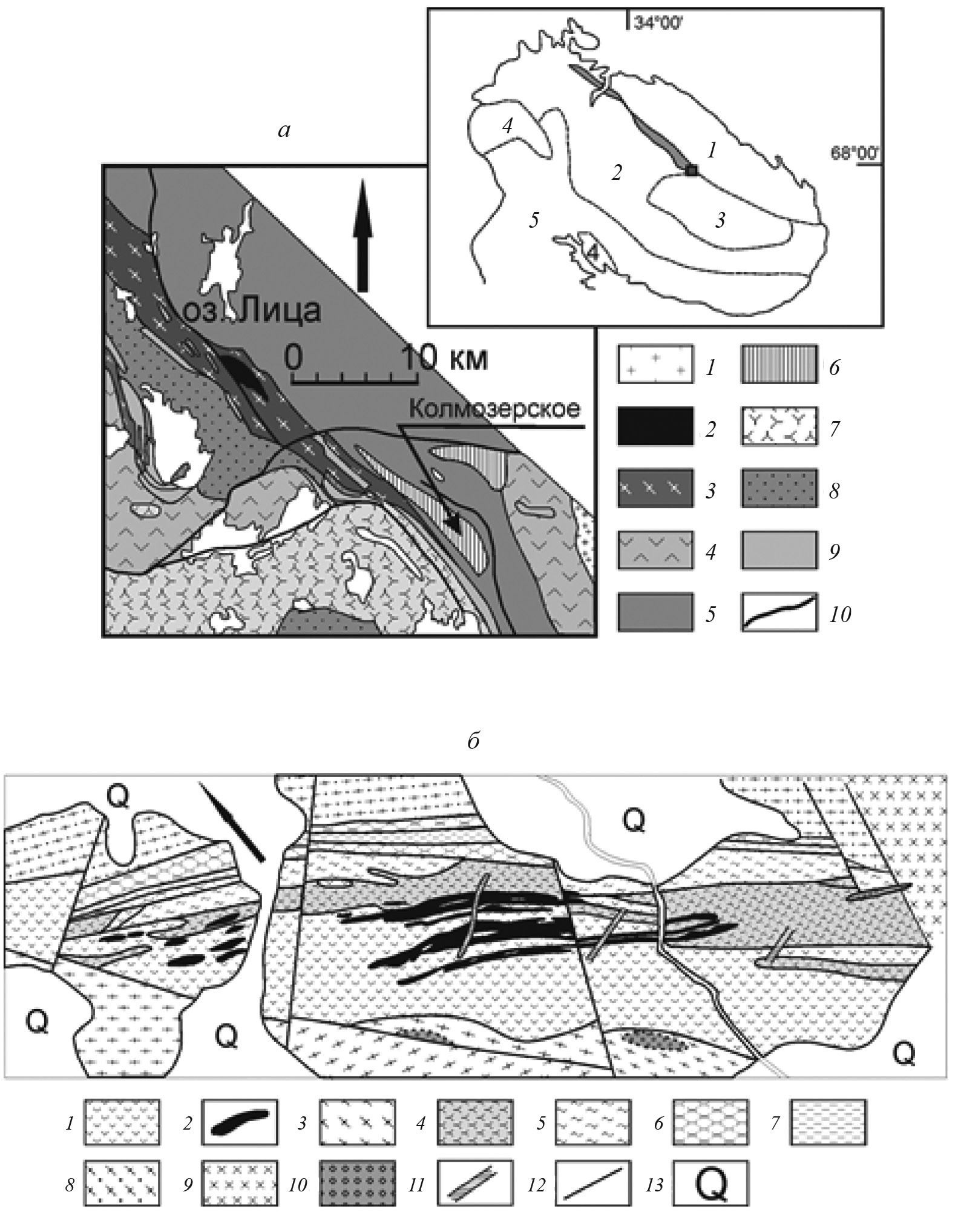 1 — микроклиновые лейкограниты, 2 — турмалиновые граниты, 3 — гранат-биотитовые и биотитовые гнейсы, гранат-кианит (андалузит)-биотитовые, гранат-кианит-ставролитовые сланцы гнейсо-сланцевого комплекса, 4 — кварцевые монцодиориты и кварцевые диориты, 5 — плагиомикроклиновые граниты и гранит-мигматиты, 6 — габбро-анортозиты, амфиболиты и хлоритовые сланцы по ним, 7 — щелочные граниты и метасоматиты по ним, 8 — амфибол-биотитовые, биотитовые, мусковит-биотитовые гнейсы и сланцы лептитового комплекса, гнейсы лебяжинской свиты Кейв, 9 — амфиболиты с реликтами ультраосновных (коматиитовых) и основных метавулканитов, шаровые лавы, железистые кварциты амфиболитового комплекса, 10 — тектонические нарушения. На врезке — зона Колмозеро-Воронья (серое) на структурной схеме Кольского региона и участок геологической схемы района Колмозерского месторождения (квадрат). Цифрами обозначены: 1 — Мурманский блок, 2 — Кольско-норвежский блок, 3 — Кейвский блок, 4 — Лапландский гранулитовый пояс, 5 — Беломорский подвижный пояс.