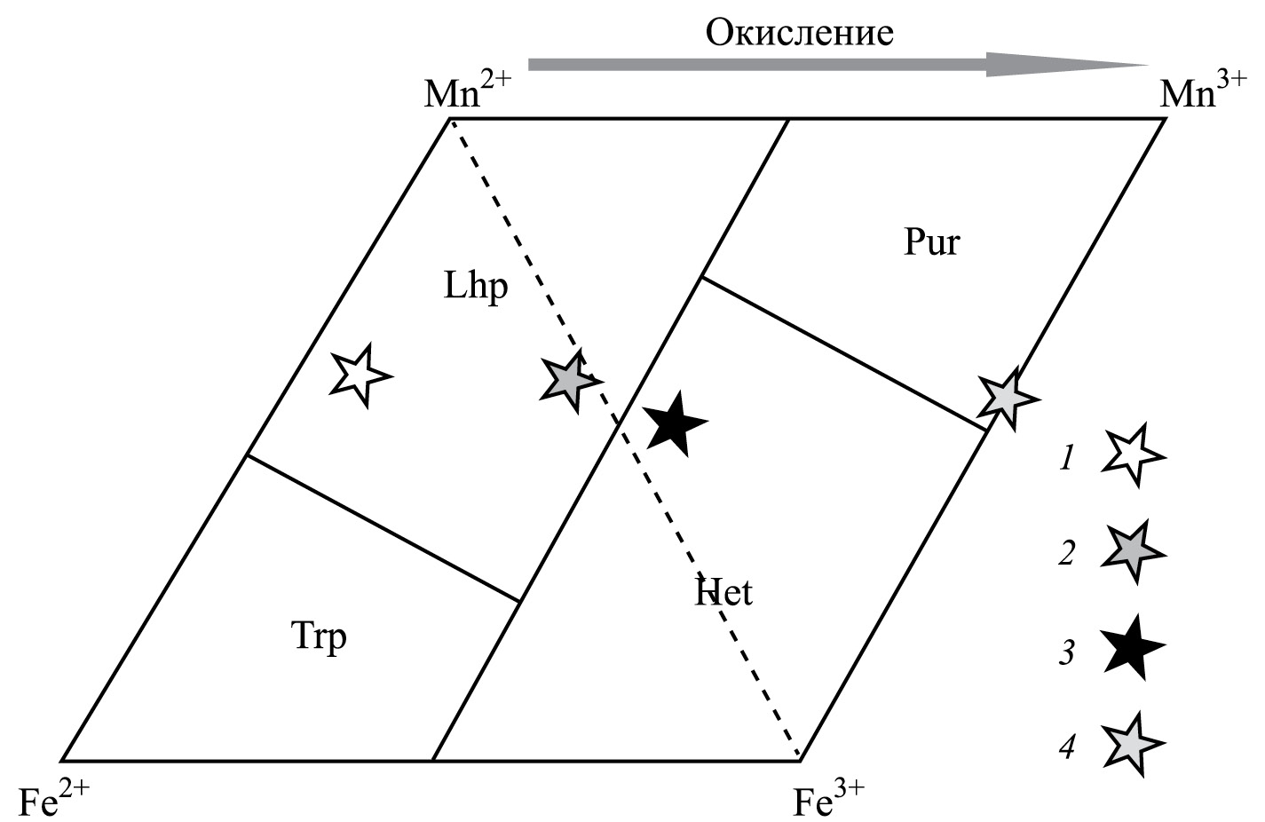 Процессы окисления, идущие в гидротермальных условиях, имеют постепенный характер (Hatert et al., 2012), хорошо выраженный для минералов с высоким содержанием марганца. Для высокожелезистых видов ряда трифилин–гетерозит, напротив, характерны резкие границы между продуктами изменения (Fontan et al., 1976; Fransolet et al., 1986). Причиной наблюдаемых различий является разница окислительных потенциалов и характера окисления железа и марганца (Schmid-Beurmann et al., 2013), в результате чего сначала окисляется железо, и только затем — марганец, что делает смену составов более плавной.