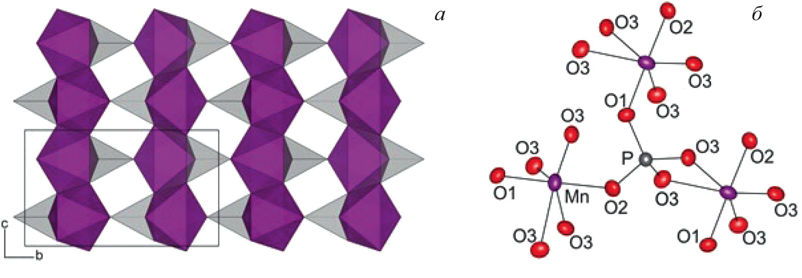 Рис. 3. Кристаллическая структура пурпурита. Проекция на плоскость bc. Фиолетовым цветом обозначены октаэдры (Mn3+, Fe3+)O6, серым — тетраэдры PO4 (а); координация (Mn3+, Fe3+)O6 октаэдров и PO4 тетраэдров (б).