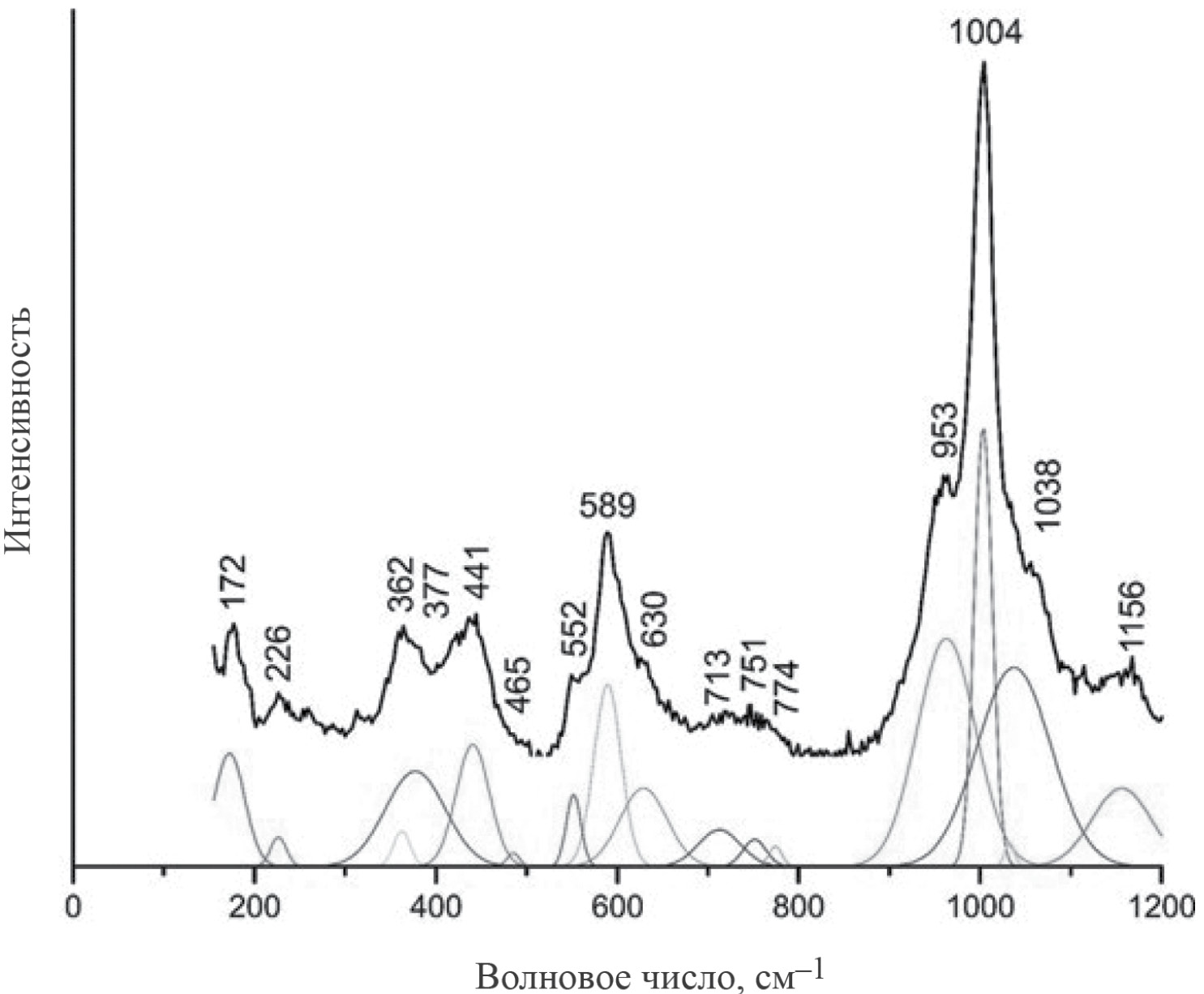 Подобно литиофилиту, большинство полос в КР-спектре пурпурита (рис. 4) связано с различными колебаниями анионной группы [PO4]3– (Frost et al., 2013). Наиболее интенсивные полосы 1004 см-1 и 953 см-1 (плечо), соответствуют симметричному колебанию ν1. Полосы 1038 см-1 и 1156 см-1 отвечают асимметричным колебаниям ν3, полосы в диапазоне 400—500 см-1 — деформационным колебаниям ν2, область 550—660 см-1 — деформационным колебаниям ν4. Полосы в диапазоне 300—400 см-1 соответствуют растяжению связей Mn–O. Низкочастотные полосы (300 см-1 и ниже) в спектрах отвечают трансляционным и либрационным (вращательным) колебаниям «катион-кислород» и решеточным модам. В диапазоне 2800—3600 см-1 полосы, которые отвечали бы колебаниям O–H, не зафиксированы.