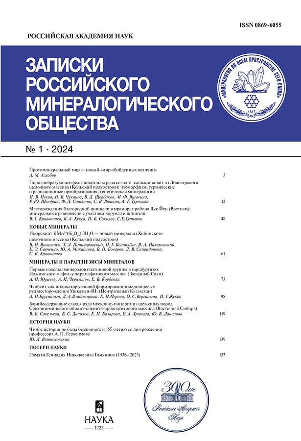 Jacobsite is a characteristic minor mineral of manganese ores at the Ushkatyn-III deposit in Central Kazakhstan. It mainly associates with hausmannite, tephroite, sonolite, friedelite, pennantite and calcite in the bulk mass of ores. A similar association, but without hausmannite, is also characteristic of jacobsite from veinlets intersecting the bulk mass ore. The chemical composition of jacobsite varies from Mn1.5Fe1.5O4 to MnFe2O4. A mineral with a high content of manganese (>1 atoms per formula unit (apfu)) dominates the bulk mass of ores, while the veins are dominated by stoichiometric jacobsite (Mn ~1 apfu). The mineral composition of ores was formed in the process of low-grade metamorphism of metal-bearing deposits of hydrothermal-sedimentary genesis. The formation of jacobsite in metamorphosed metal-bearing deposits occurs under reducing conditions. With an increase in oxygen fugacity (oxidation potential), jacobsite is replaced by the association of hausmannite with hematite. Crystallization of jacobsite in the veinlets intersecting the hausmannite ores is carried out due to the entry of iron-containing hydrothermal solutions into them. It is assumed that jacobsite veinlets serve as mineralogical markers through seepage of ore-bearing hydrothermal structures («feeding channels») producing manganese-rich ores.
