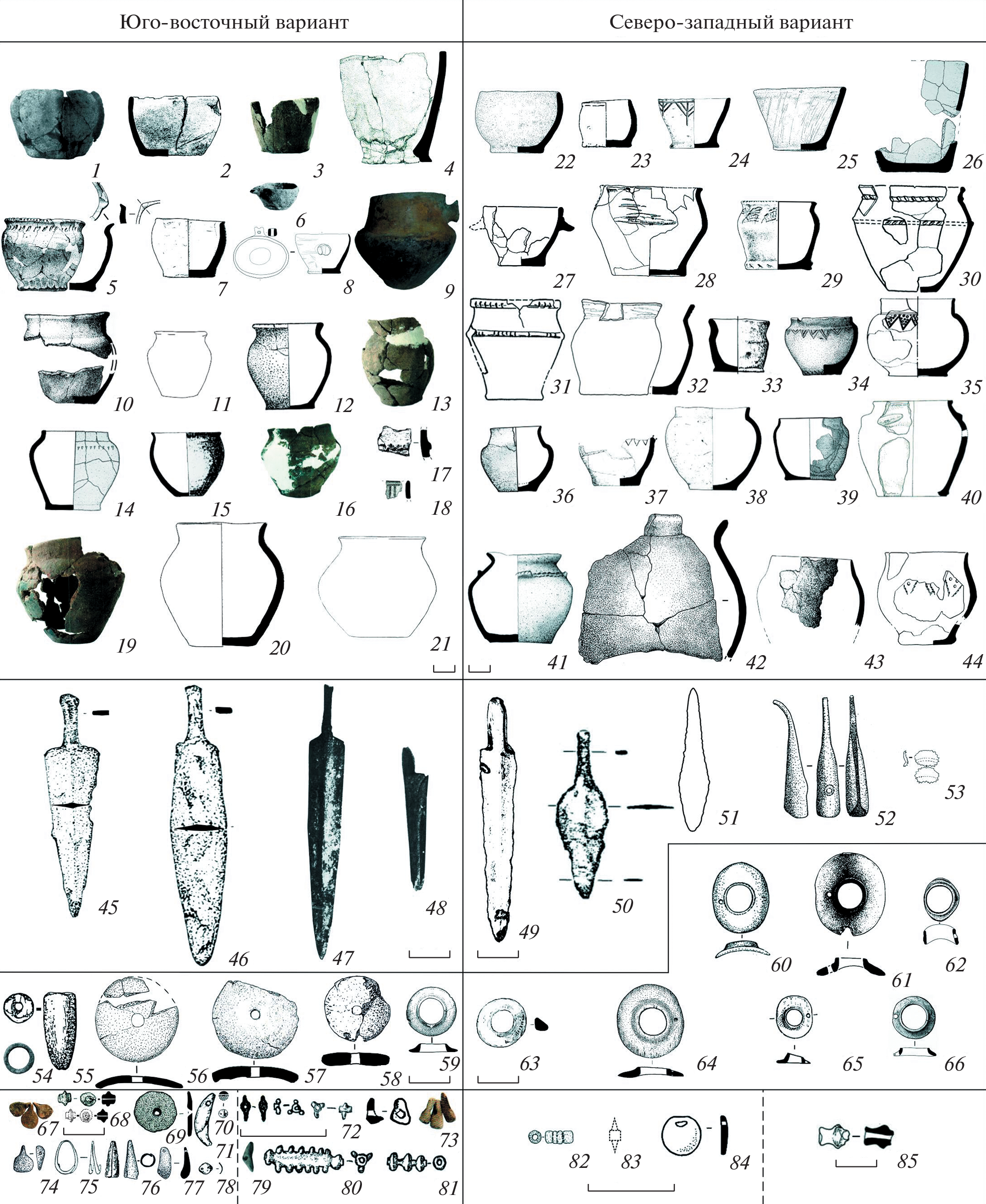The article presents characteristics of a new cultural formation in the Western and Southern Ciscaucasia of the post-Catacomb period – the Nevinnomyssk culture represented by burial sites. Burials were made in pits and occasionally in niche graves, the skeletons are arranged in a crouched adorative position, the skulls are oriented mainly to the east and southeast. The grave goods include ceramic ware, a metal tool complex, bone belt buckles and pendants, and a set of various ornaments. An analysis of the material made it possible to identify two local variants in the Nevinnomyssk culture: southeastern and northwestern. Materials of the first one show influences of the neighbouring Dnieper-Don Babino culture, while the second one demonstrates influence of the Lola culture. In its development, the Nevinnomyssk culture went through three stages within 2200–1800 CalBC. It is an integral part of the block of post-catacomb cultural formations and an important component of Lola cultural circle.