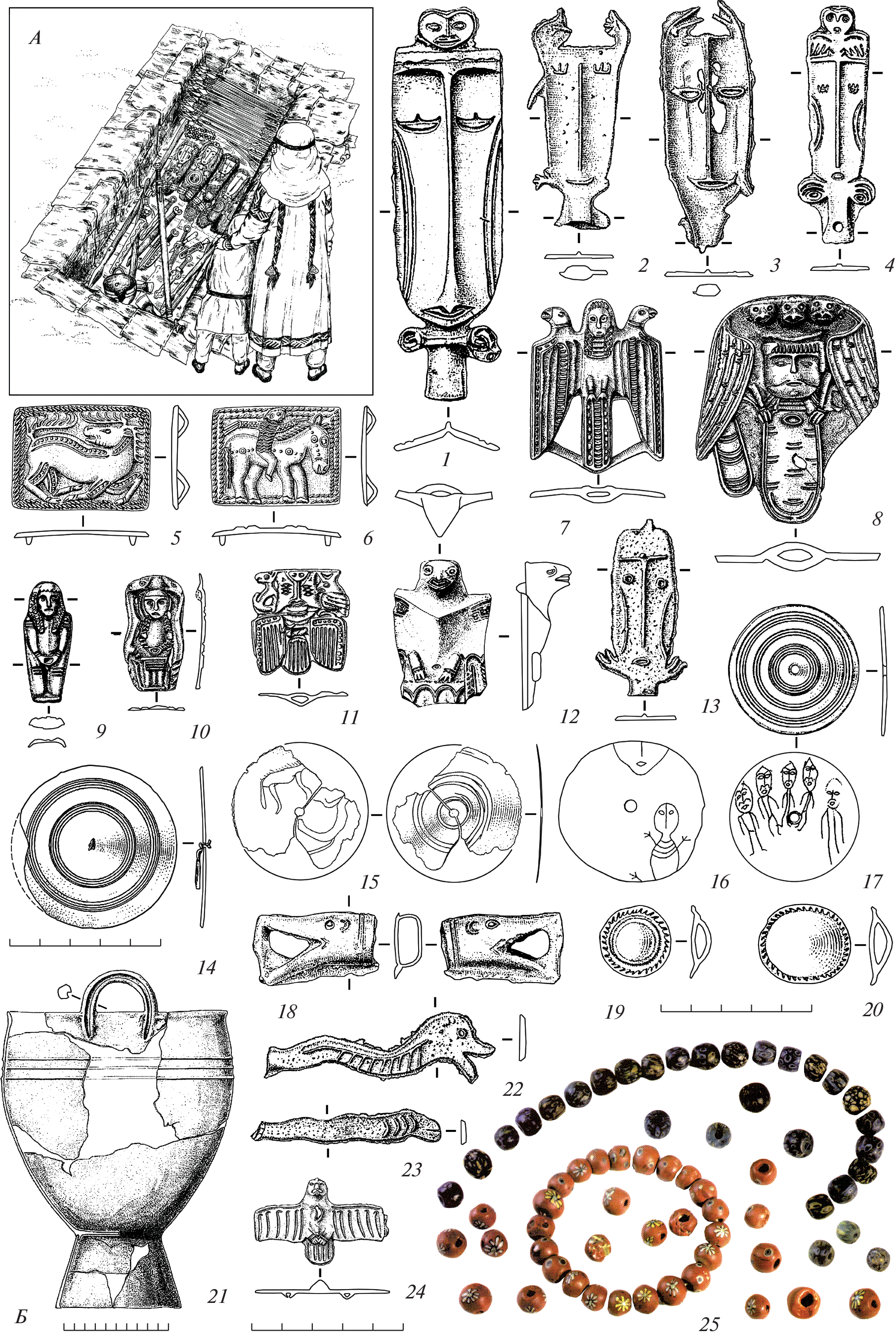 За последние четыре десятилетия в таежных областях Сургутского и Нижнего Приобья открыты шесть уникальных погребальных объектов раннего железного века с большим количеством импортного и местного инвентаря: одиночные могилы, клад с регалиями шамана, захоронение кукол-иттарма, олицетворявших группу воинов, погибших на чужбине. Исследованные памятники принадлежали представителям местной элиты. Аналогичных комплексов эпох камня и бронзы здесь не выявлено. Это свидетельствует о наличии социального расслоения в угорских и угро-самодийских обществах западного ареала кулайской культурно-исторической общности (КИО) в I–IV вв. до н.э. Между тем появление в данном регионе бастионно-башенных крепостей, медных фигурок антропоморфов в шлемах и “солнечных” коронах, а также находка наконечника стрелы “кулайского типа” в жилище белоярской культуры предполагают начало формирования образа воина-вождя-богатыря-духа и отделенного от рядовых общинников слоя воинской, имущественной и культовой элиты, возможно, еще раньше – около середины I тыс. до н.э. Главной предпосылкой этих явлений, равно как появления изделий из железа в таежных обществах Приобья в условиях отсутствия производящего хозяйства (скотоводство, земледелие), стало включение охотников-рыболовов севера Западной Сибири в систему экономики Евразии на правах регулярных поставщиков пушнины.