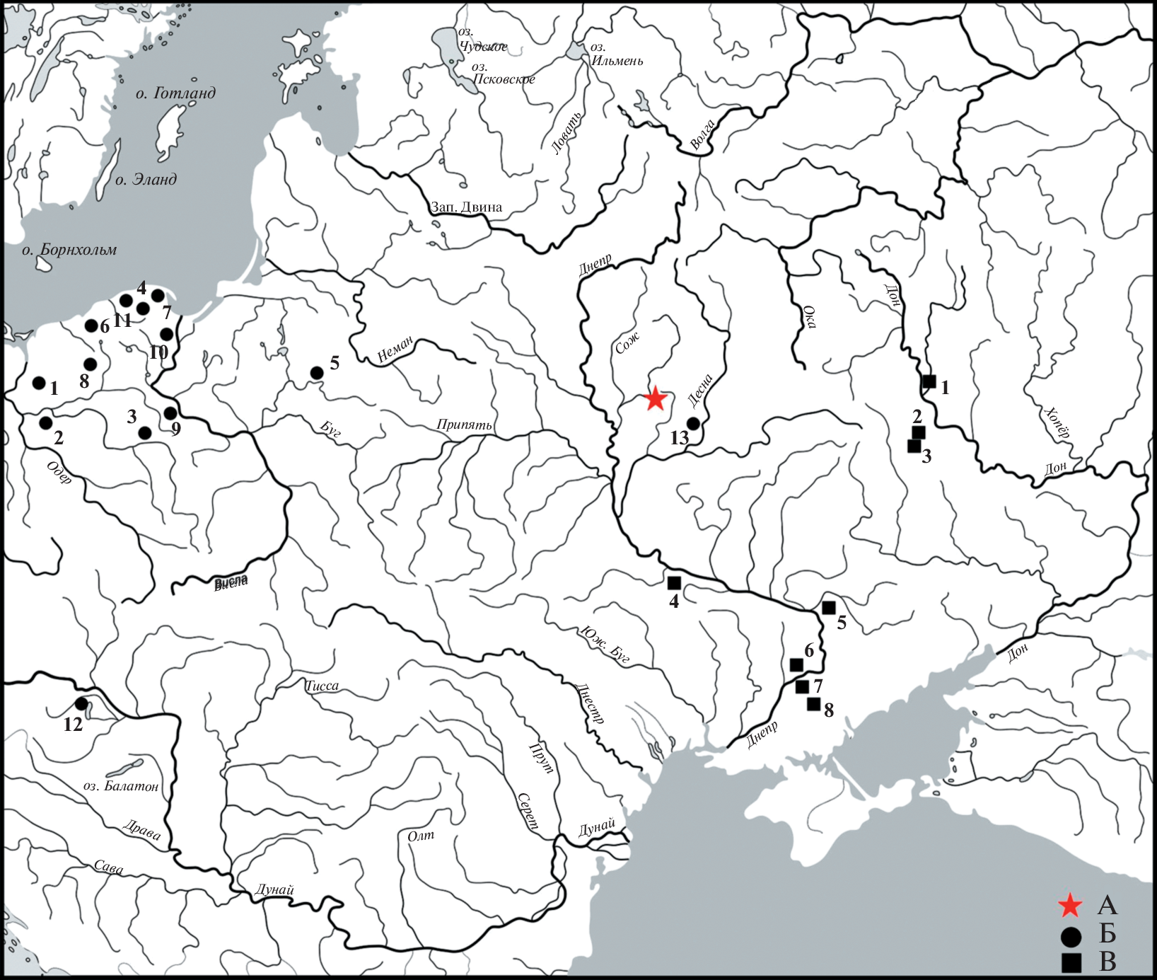 - Еременко В.Е. Археологическая карта милоградской культуры // Славяне. Этногенез и этническая история. Л., 1989. С. 76–177.