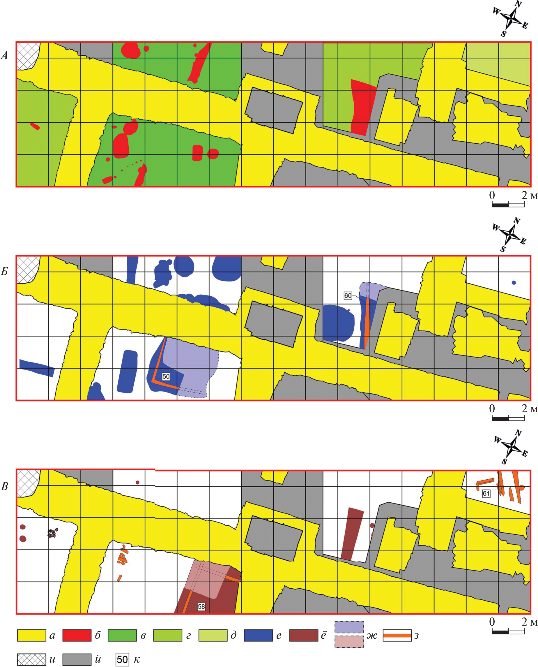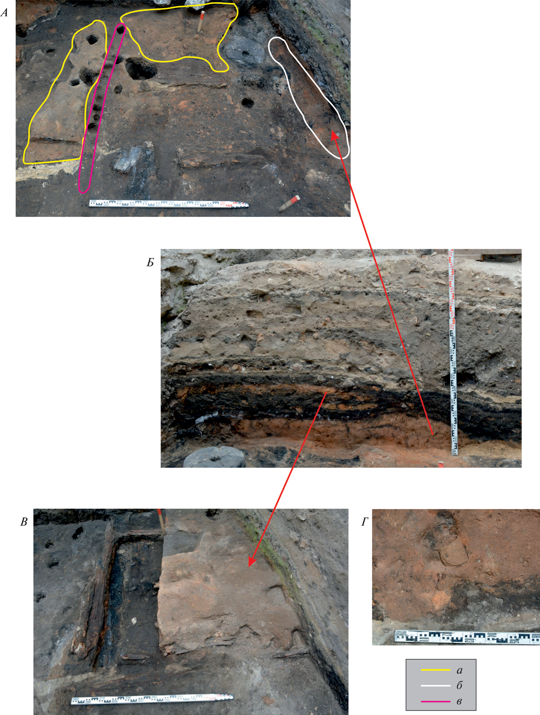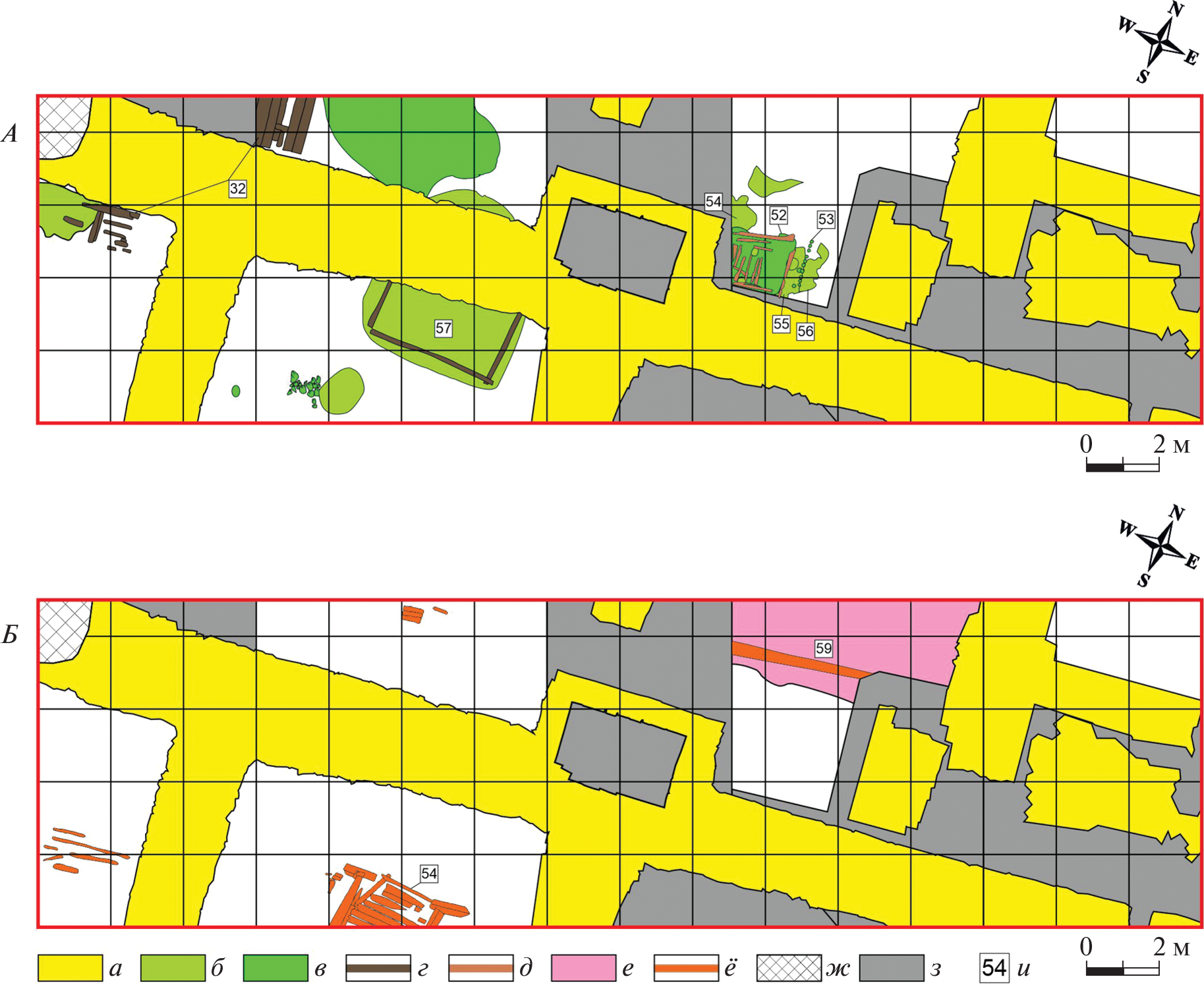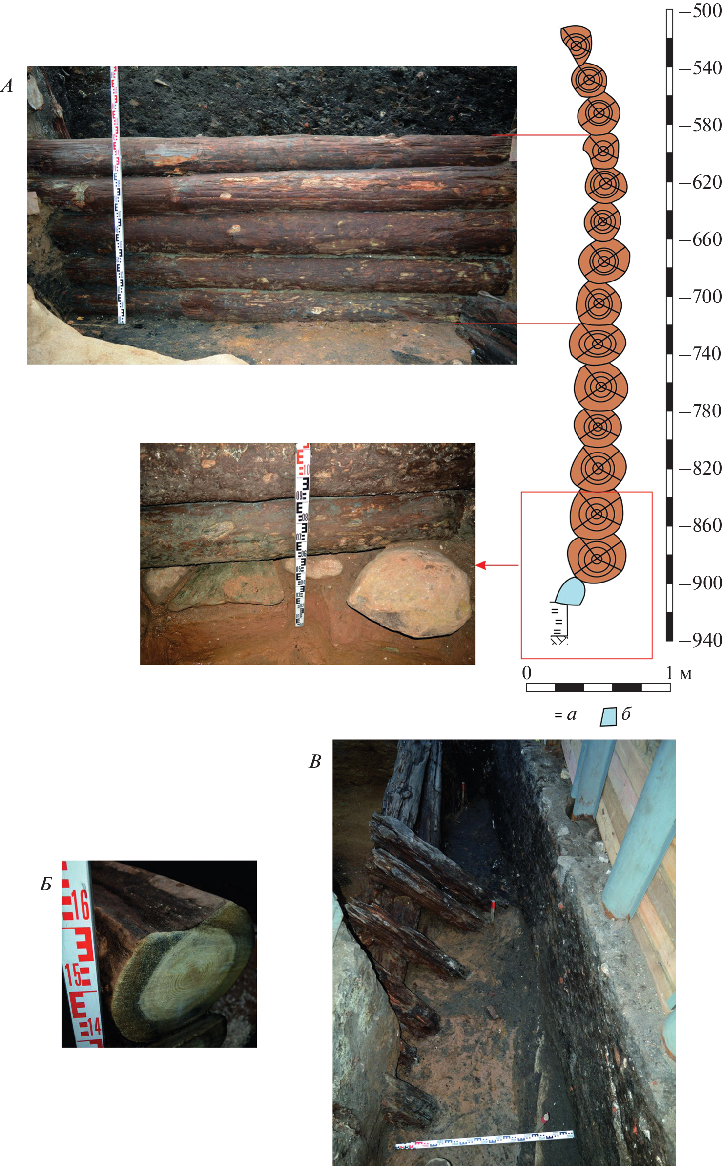 The wooden structures that were part of the manor complexes of the 14th – the first half of the 16th century AD are the remains of above-ground structures and cellars dug into the ground. The latter were log frames placed in a pit dug for them. Most of the log frames were made of oak or young pine and spruce logs, which prevent researchers from obtaining a series of reliable dendrochronological dates. The above-ground (residential and economic) structures have survived in a worse condition, some of them perished in a fire at the end of the 15th century AD. Remains of ovens made of raw bricks are associated with residential buildings. The compact arrangement of the studied structures, the construction of cellars and ovens on the same site testifies to the stable layout of the estate space for a long time – from the 14th to the middle of the 16th century. At the end of the site functioning period, a very large cellar up to 5 m deep appeared on it, which could be related to the temporary court of Ivan III at the end of the 15th century.