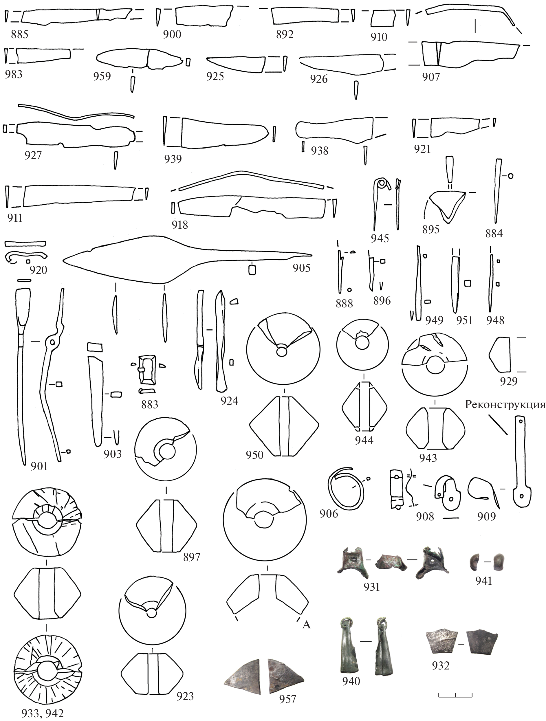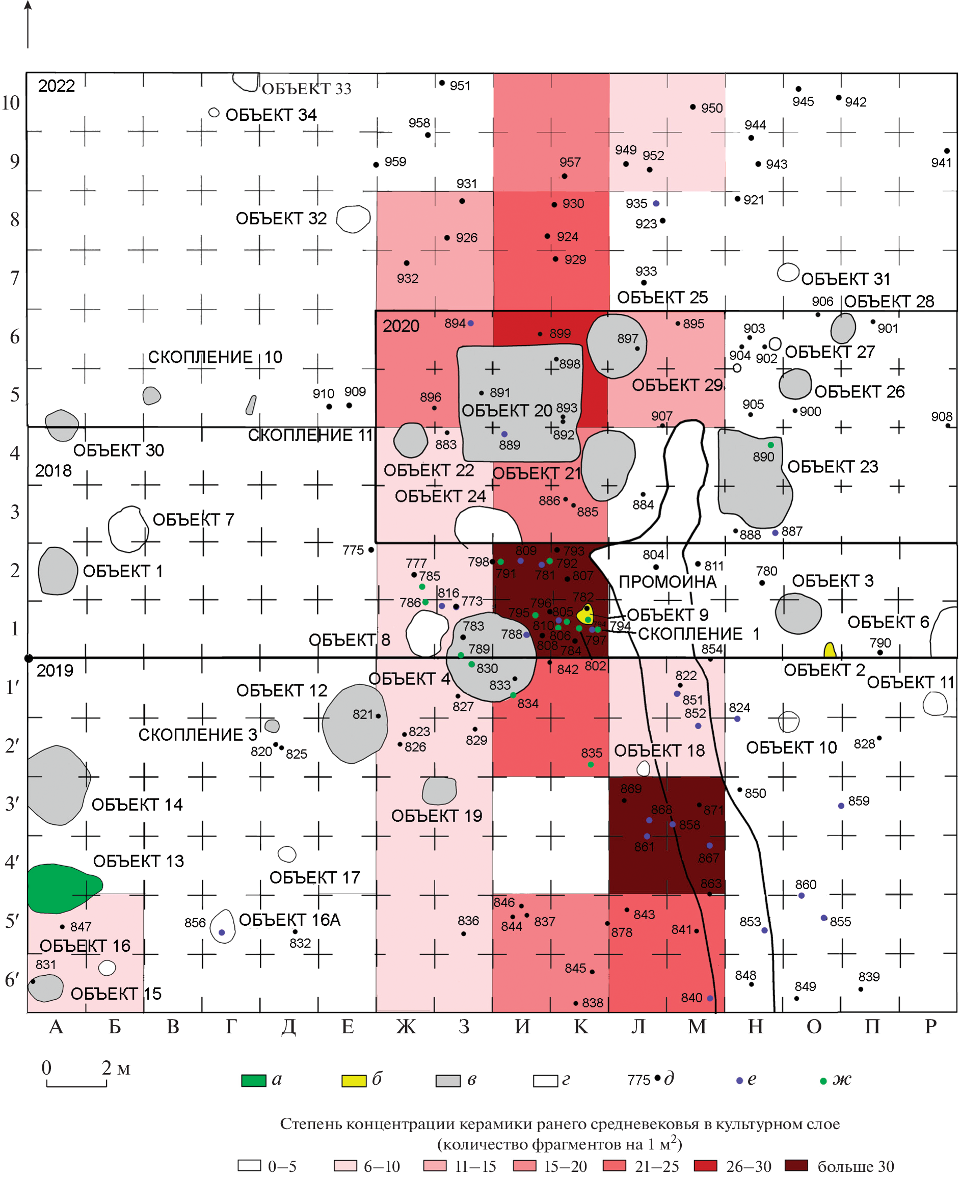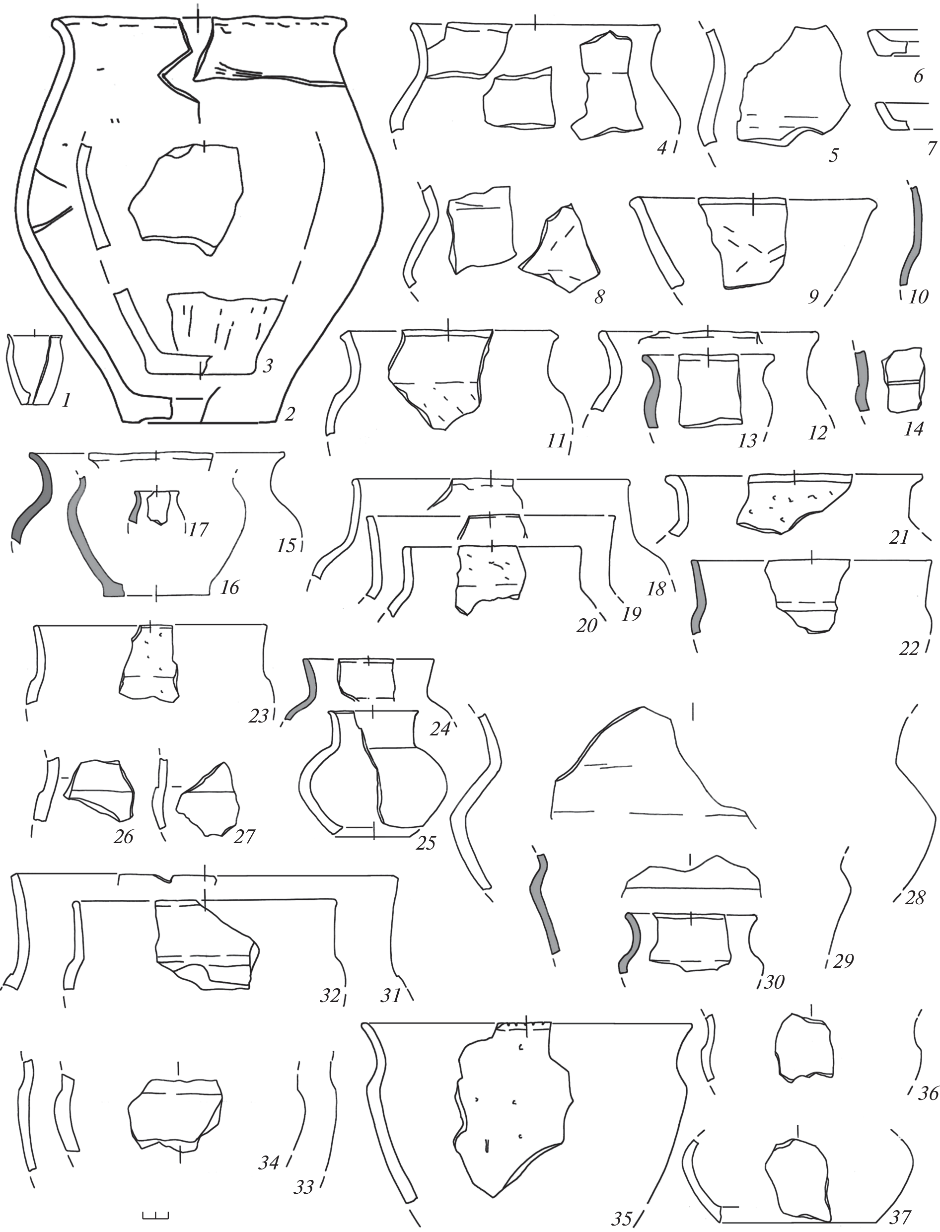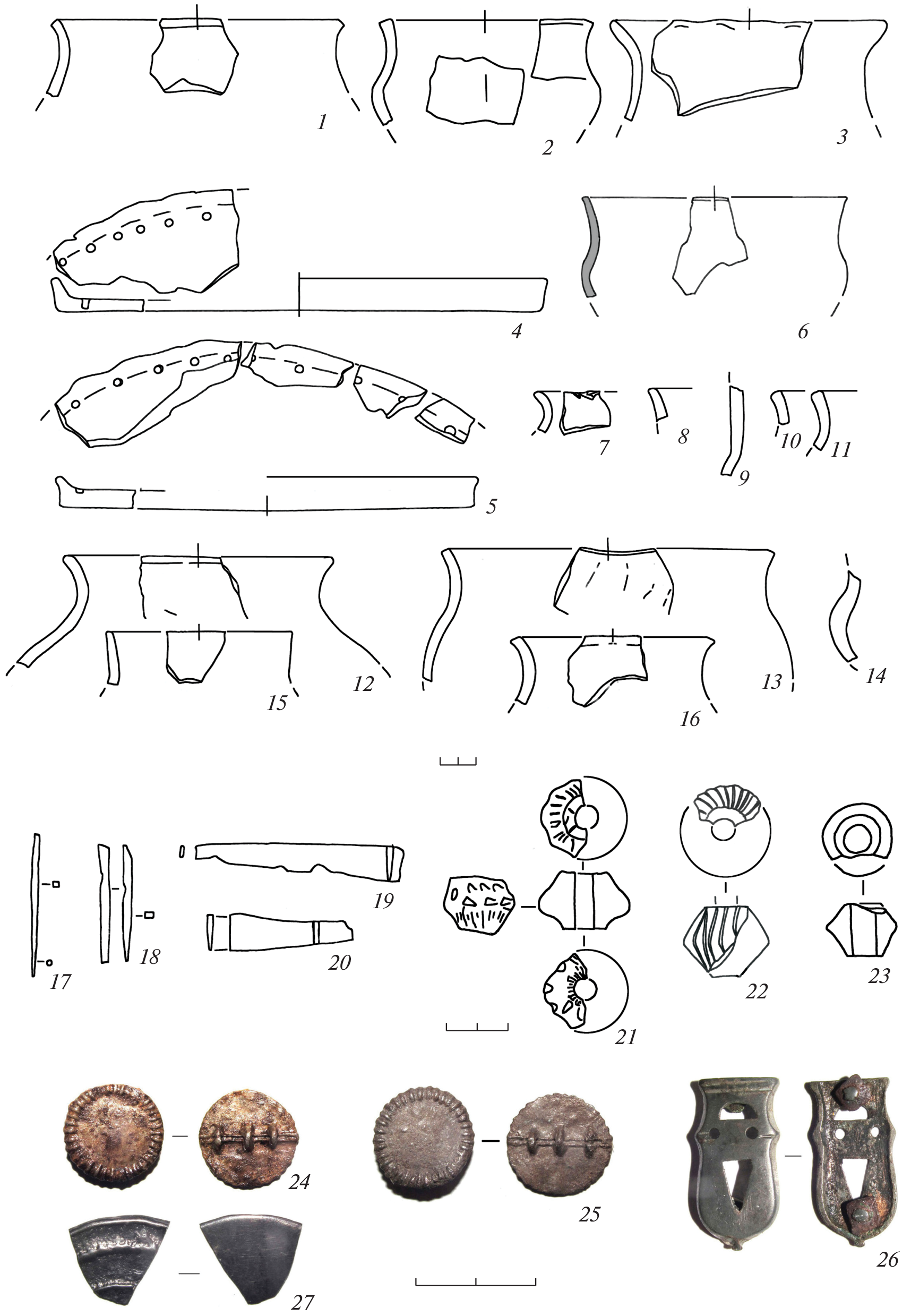 In the eastern part of the Staevo-5 settlement, an estate consisting of a dwelling, two outbuildings, two hearths, and a series of pits has been completely explored. From the south, its territory was limited by a fence resting on massive pillars. The estate belongs to the initial stage of the settlement functioning and dates back to the late 5th–6th century AD (possibly, the first half of this century). Based on the distribution of ceramics in the structures and the cultural layer, it was possible to distinguish three conditionally closed complexes. The first one refers to the period of the estate functioning, the second – to the period of its destruction, the third (the latest) – to the garbage dump that was formed in its place. It is indicative that all three complexes include ceramics of both the post-Kiev and Oka traditions. Thus, from the very beginning of the settlement existence, two main components of the Upper Voronezh cultural group are distinguished in the composition of its population – the Early Slavic and Finnish ones. The estate dwellers were engaged in jewellery and bronze casting. They used a domestic hearth for melting metal. The crucibles, most likely, were made of clay which was prepared for this reason in one of the pits.