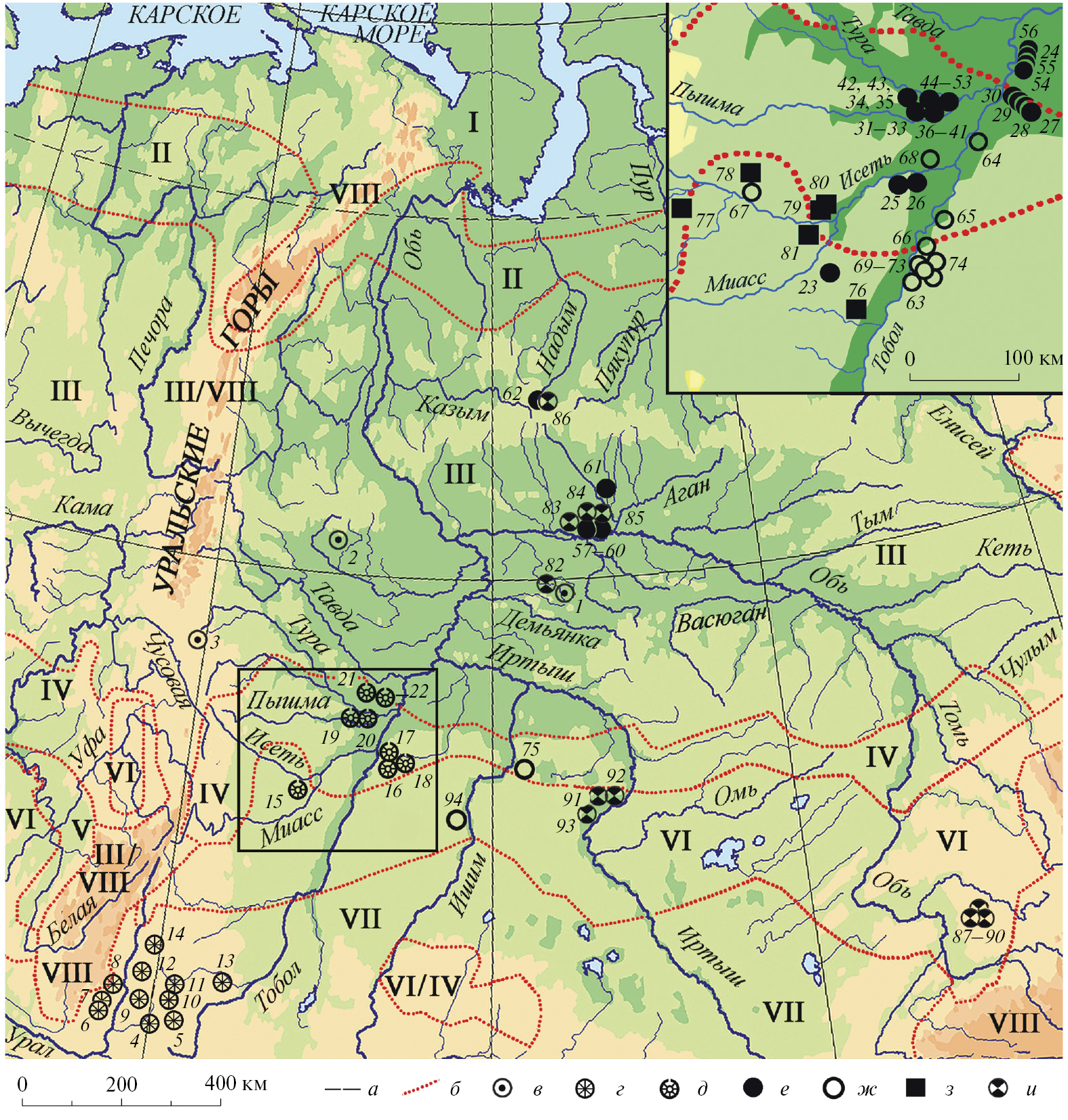 Рис. 1. Карта основных круглоплановых поселений неолита – раннего железного века Зауралья и Западной Сибири: 1 – Каюково 2*; 2 – Большая Умытья 9*; 3 – Полудёнка I*; 4 – Аландское*; 5 – Берсуат (Ягодный Дол)*; 6 – Селек (1-я площадка); 7 – Улак 1*; 8 – Кизильское (ранний горизонт)*; 9 – Аркаим (Утяганское)*; 10 – Синташта I*; 11 – Журумбай; 12 – Сарым-Саклы (Сарым-Сакла, Зингейка); 13 – Исеней I и II; 14 – Шикуртау; 15 – Ташково II*; 16 – Заводоуковское X*; 17 – Заводоуковское VIII/1; 18 – Заводоуковское XIII*; 19 – САО*; 20 – ЮАО XIII*; 21 – Иска III*; 22 – Шапкуль VIII, X; 23 – Санаторий “Лесные Горки”; 24 – Нерда 20; 25 – Онуфриевский Борок*; 26 – Сазык 8; 27 – Карагай Аул 4*; 28 – Карагай Аул 1*; 29 – Вак Кур 2*; 30 – Юртобор 6; 31 – Кыртым 2*; 32 – Кыртым 1*; 33 – Мичуринец 3; 34 – Андреевские 5* и 7*; 35 – Андреевское 6; 36 – Кыртым 3; 37–41 – ЮАО 5, 11, 15, 18, 23; 42 – Андреевское 11; 43 – Болотное 4; 44 – Белый Яр 4; 45 – Митюшино 5; 46 – Энергетик 1; 47 – Антонова Старица 1; 48–53 – Пламя Сибири 1–6; 54 – Варвара 1; 55 – Бор 1; 56 – Караульный Яр 4; 57 – Барсов городок I/9*; 58 – Барсов Городок III/1*; 59 – Барсов городок III/2*; 60 – Барсов Городок III/7*; 61 – Ермаково IV; 62 – Нумто II*; 63 – Баитовское (Чудаки)*; 64 – Большой Имбиряй 3*; 65 – Боровушка 2*; 66 – Бочанецкое*; 67 – Нижне-Суварышское I; 68 – Слободо-Бешкильское; 69–73 – Увал 1, 2, 3, 4*, 5*; 74 – Камышное I (Романовское)*; 75 – Лихачевское (Ерзовка)*; 76 – Гороховское-Чудаки*; 77 – Мало-Казахбаевское*, 78 – Нижне-Суварышское V; 79 – Ильтяковское; 80 – Юлдус 1; 81 – Мурзинское; 82 – Соровское XXXIV; 83 – Кучиминское XV; 84 – Барсов Городок I/6*; 85 – Барсов Городок II/5; 86 – Нумто III; 87–89 – Городище 3*, 7, 8; 90 – Малый Иткуль 4*; 91 – Батаково VI (Инберень IV)*; 92 – Батаково XIX*; 93 – Кушайлы; 94 – Марай 4*. Условные обозначения: а – Северный полярный круг; б – границы современных природно-климатических зон (I – тундра; II – лесотундра; III – редколесье; IV – тайга; V – широколиственно-лесная; VI – лесостепь; VII – степь; VIII – горные районы); в – городища неолита (1–3); г – синташтинские городища начала эпохи бронзы (4–14); д – ташковские “подкрепленные” поселения начала эпохи бронзы (15–22); е – юртоборские городища рубежа бронзового и железного веков (23–56); ж – белоярские, калинкинские, баитовские городища РЖВ I (57–75, 94); з – гороховские городища РЖВ I (76–81); и – кулайские и саргатские городища РЖВ II (82–93). Здесь и на рис. 2–8: * – памятники, на которых закладывались раскопы или разведочные траншеи.