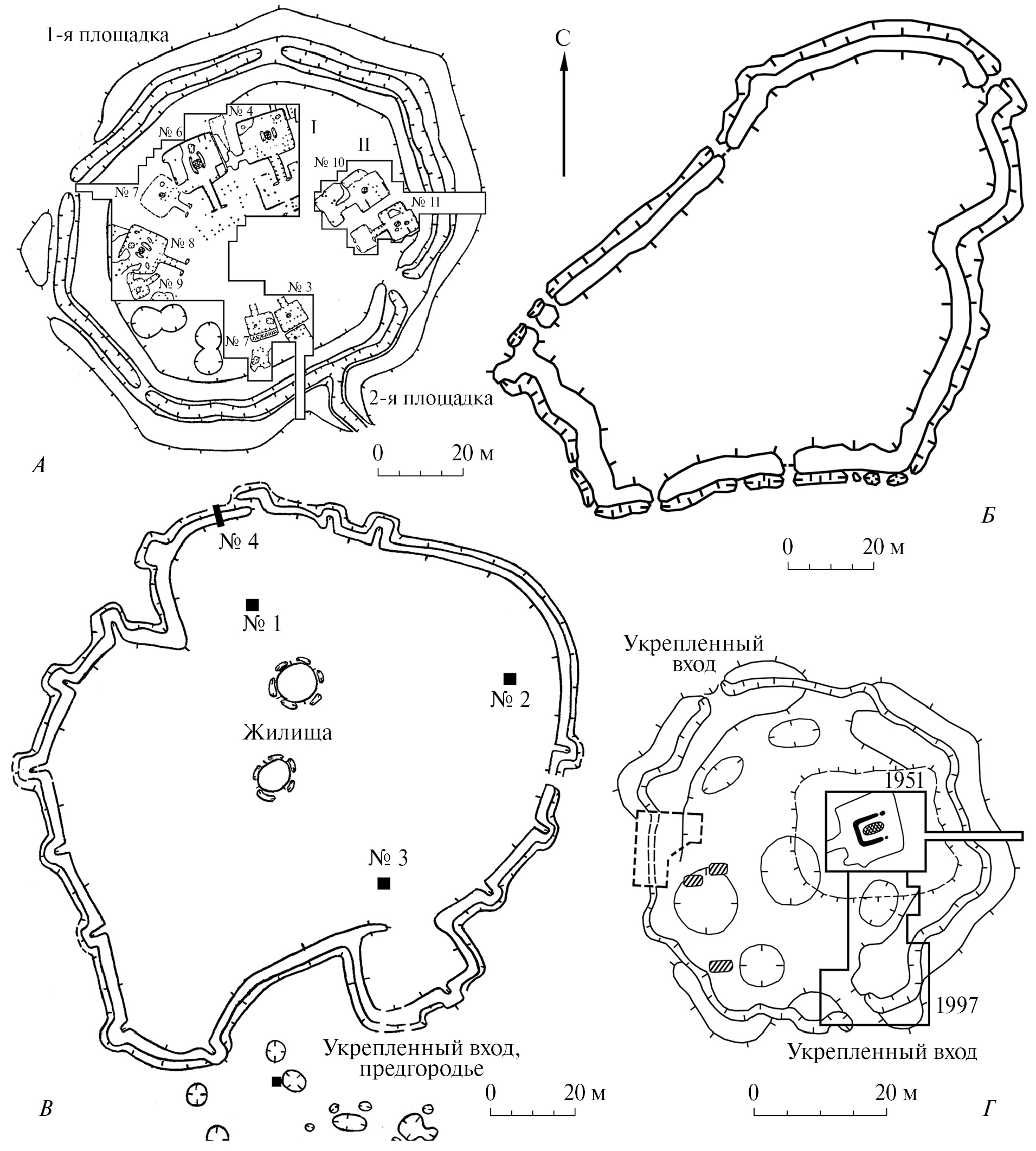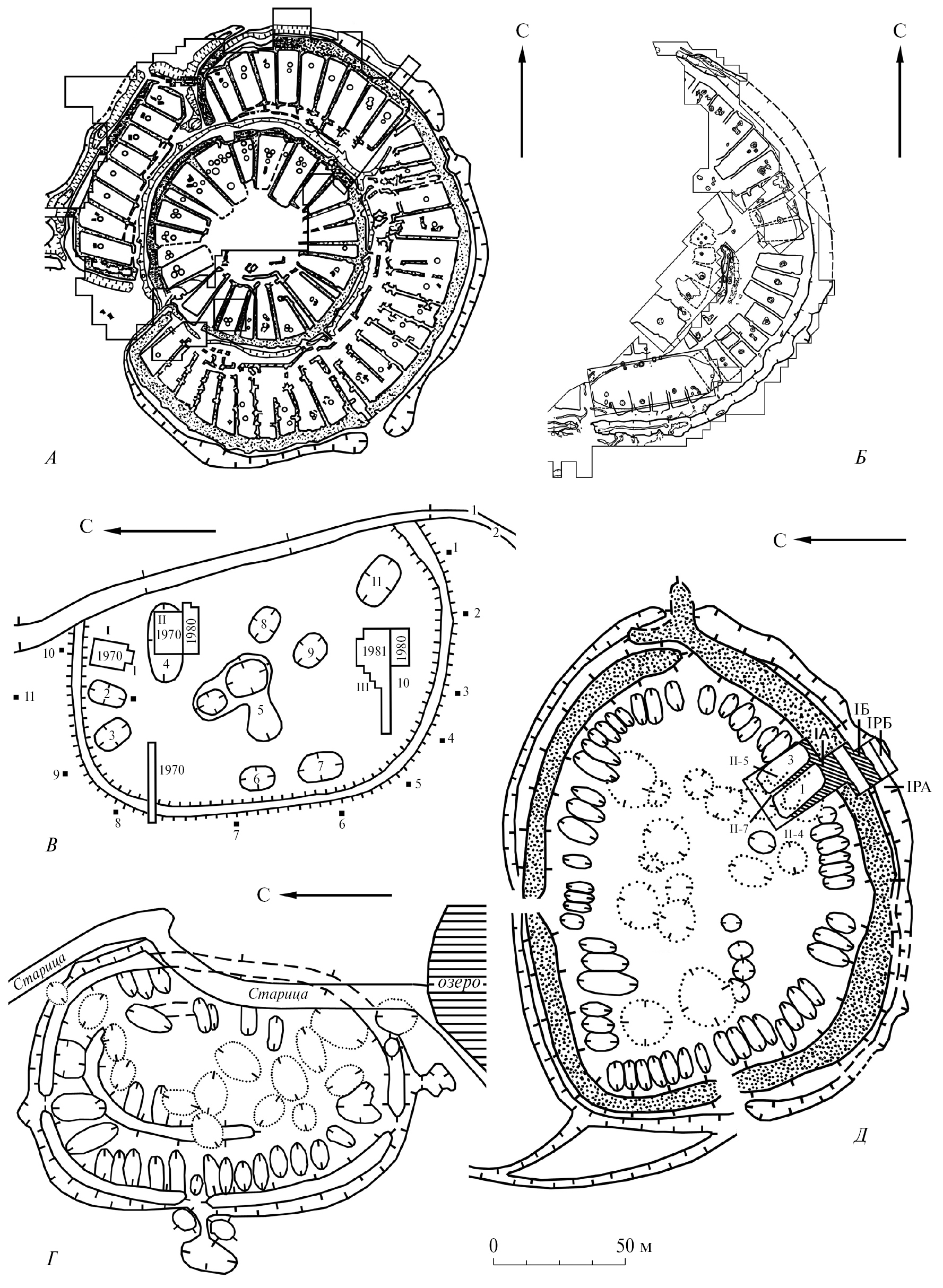 Рис. 7. Кольцевые городища гороховской культуры раннего железного века: Гороховское (Чудаки)* (А), Ильтяковское (Б), Нижне-Cуварышское IV (В), Мало-Казахбаевское* (Г). Раскопки и съемки К.В. Сальникова 1937–1939, 1949 гг., Г.В. Бельтиковой, В.Е. Стоянова 1975–1977 гг. (А); К.В. Сальникова 1951 г., А.В. и М.Г. Епимаховых 1997 г. (Г). Разведки и съемки К.В. Сальникова и др. 1958 г., Н.Б. Виноградова 1986 г. (Б), В.А. Борзунова, А.А. Ковригина 1992 г. (В).