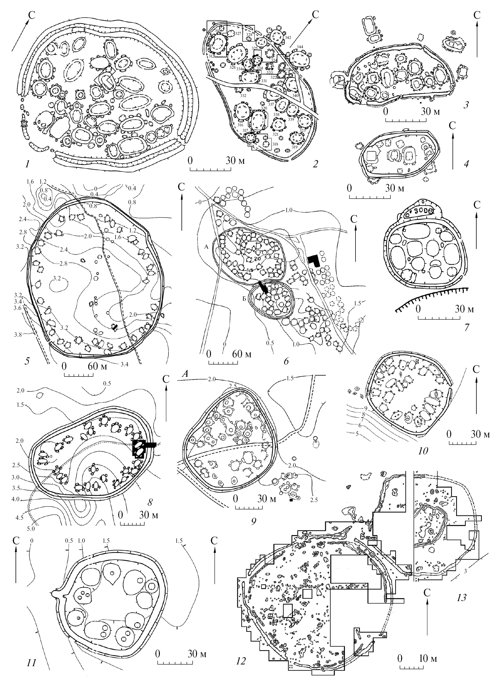 Рис. 5. Кольцевые городища белоярской (1–3) и калинкинской (4, 7) культур раннего железного века, юртоборской культуры рубежа бронзового и железного веков (5, 6, 8–13). 1 – Барсов Городок III/1*; 2 – Барсов Городок III/7*; 3 – Ермаково IV; 4 – Нумто II (4); 5 – Кыртым 1*; 6 – Вак Кур 2*; 7 – Барсов Городок I/9; 8 – Карагай Аул 4*; 9 – Андреевское 11; 10 – Нерда 20; 11 – Сазык 8; 12 – Андреевское 7*; 13 – Андреевское 5* (1–4 – по Чемякин, 2008. Рис. 46, 1–3; 61, 6; 4, 7 – по Чемякин, Зыков, 2004. Рис. 4; 5, 6, 8–12 – по Зимина, Зах, 2009. Рис. 3; 4; 10; 16; 50; 58; 66; 67; 72).