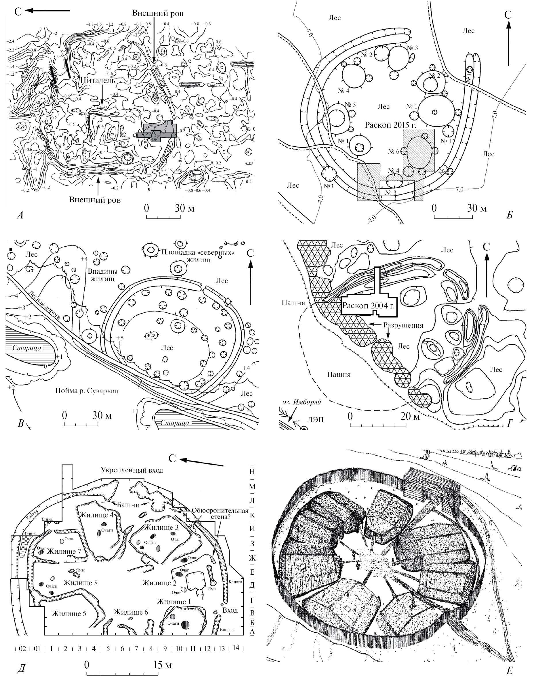 Рис. 6. Кольцевые городища баитовской культуры раннего железного века: Баитовское (Чудаки)* (А), Марай 4 (Б), Нижне-Суварышское I (В), Большой Имбиряй 3* (Г), Лихачевское (Ерзовка)* (Д, Е). Раскопки Л.Н. Коряковой и др. 1995–1996 гг., съемки Л. Лангвета 1996 г. (А). Разведка С.Н. Скочиной 2014 г.; раскопки и съемки В.В. Илюшина, В.А. Заха и др. 2015 г. (Б). Разведка А.А. Ковригина и др. 1992 г. (В). Раскопки и съемки Н.П. Матвеевой 2004 г. (Г), В.Ф. Генинга, В.Е. Стоянова, Г.Б. Здановича 1964 г.; В.Ф. Генинга 1966 г. (Д). Реконструкция С.И. Цембалюк, С.В. Берлиной 2014 г. (Е).