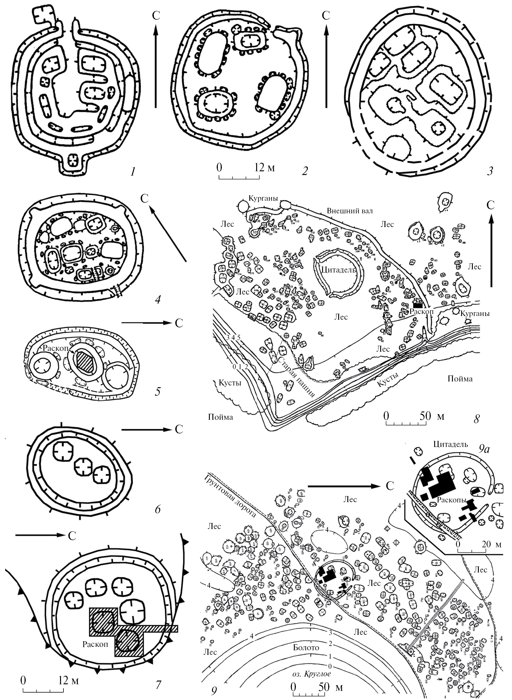 Рис. 8. Кольцевые городища кулайской (1–7) и саргатской (8, 9, 9а) культур раннего железного века: 1 – Соровское XXXIV; 2 – Кучиминское XV; 3 – Барсов Городок I/6*; 4 – Нумто III; 5 – Барсов городок III/5; 6 – Городище 7; 7 – Сошниково I; 8 – Батаково XIX*; 9 – Батаково VI (Инберень IV)*; 9а – Батаково VI, цитадель* (1, 2, 4 – по Борзунов, 2002. Рис. 3, 32, 37, 48; 3, 5–7 – по Очерки культурогенеза…, 1994. Рис. 26, 4, 5; 21, 4, 5). 8, 9, 9а – раскопки и съемка Л.И. Погодина 1996, 1997 гг.
