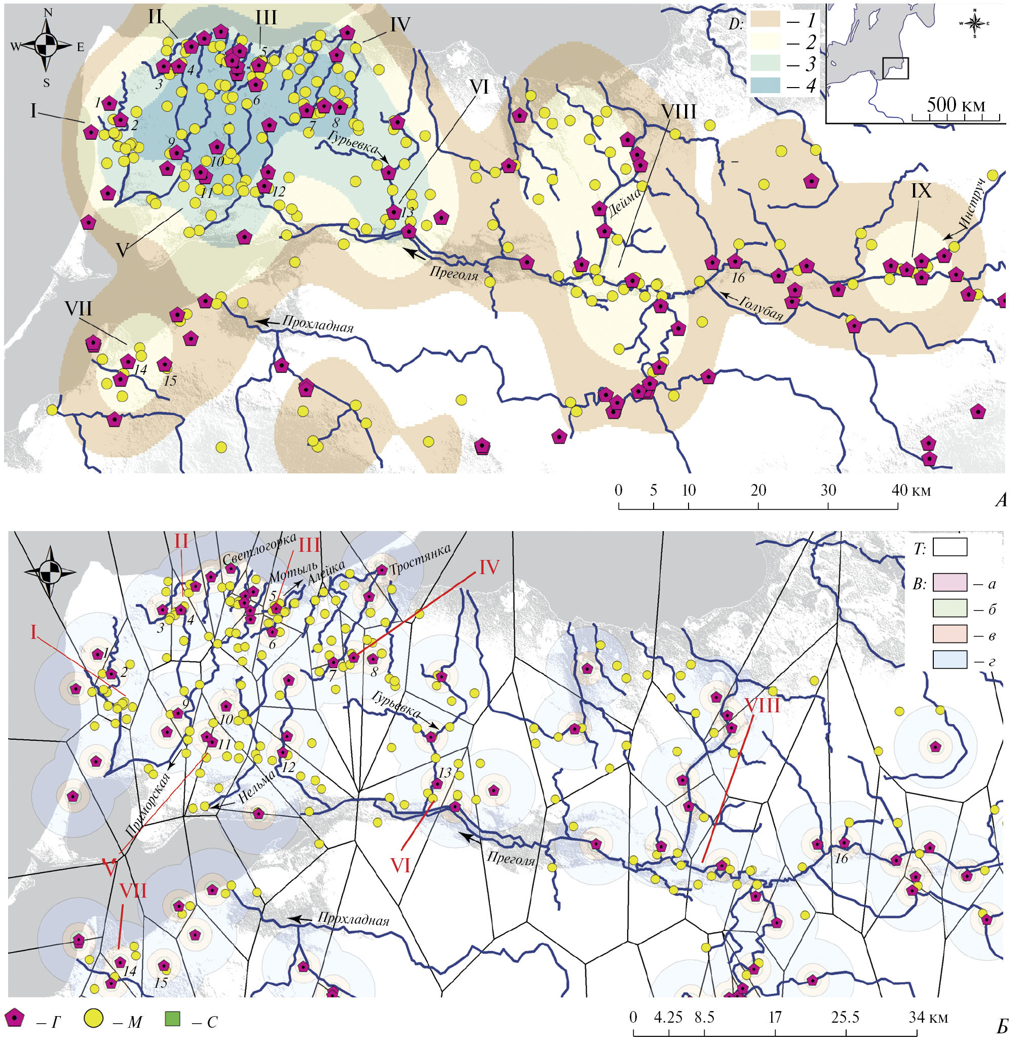 Рис. 1. Скопления памятников самбийско-натангийской культуры: A – скопления грунтовых могильников, Б – анализ полигонов Тиссена и буферных зон городищ: I – у современного пос. Янтарный (река Приморская), II – вдоль реки Светлогорка, III – междуречье рек Мотыль, Забава, Алейка, IV – междуречье рек Медвежья и Куровка, V – среднее течение реки Нельма, VI – нижнее течение реки Гурьевка, VII – вдоль побережья Калининградского (Вислинского) залива, VIII–XI – долина реки Преголя; городища, обсуждаемые в статье: 1 – Русское/ Ellerhaus, 2 – Русское/Germau, 3 – Грачевка/Craam, 4 – Богатое/Pokirben, 5 – Куликово/Kringitten, 6 – Геройское/ Eisliethen, 7 – Ветрово/Ekritten, 8 – Моршанское/Schreitlacken, 9 – Медведево/Klein Norgau, 10 – Кумачево/ Galgarben, 11 – Логвино/Medenau, 12 – Котельниково/Wargen, 13 – Заозерье/Rodmannshöfen, 14 – Московское/ Partheinen, 15 – Первомайское/Warnikam, 16 – Кудрявцево/Kuglacken. Условные обозначения здесь и далее на рисунках: T – полигоны Тиссена; B – буферные зоны (а – 500, б – 1000, в – 2000, г – 5000 м); D – плотность могильников (на 30 км) (1 – 1–2, 2 – 2–3, 3 – 3–5, 4 – 5–8); Г – городище, М – могильник, С – селище. Основа карт – цифровая модель рельефа с использованием SRTM данных, топографическая и геологическая карты генерального штаба Пруссии (Messtischblatt).