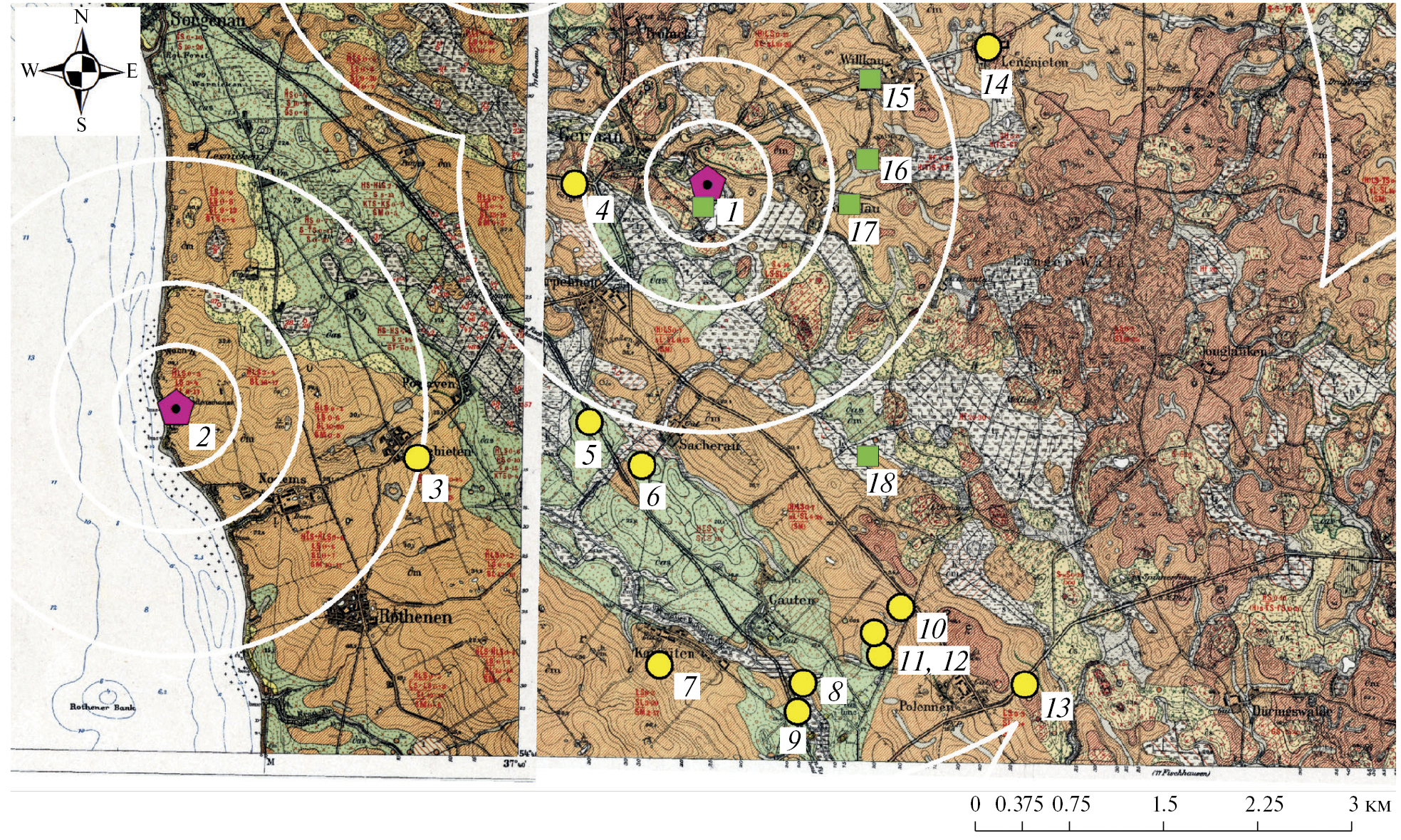 Рис. 2. Расположение могильников и поселений относительно буферных зон городищ у пос. Янтарный: 1 – Русское/Germau, 2 – Окунево/Nodems, 3 – Гребитен/Grebieten, 4 – Поваровка/Kirpehnen-Galgenberge, 5 – Поваровка/Kirpehnen, 6 – Морозовка/Sacherau-Ellerhaus, 7 – Корьейтен/Corjieten, 8–9 – Гутен/Gauten, 10–12 – Путилово/Gauten, 13 – Поленен/Polehnen, 14 – Щорсово/Lengniethen, 15–17 – Сычево 1–3, 18 – Путилово 2.