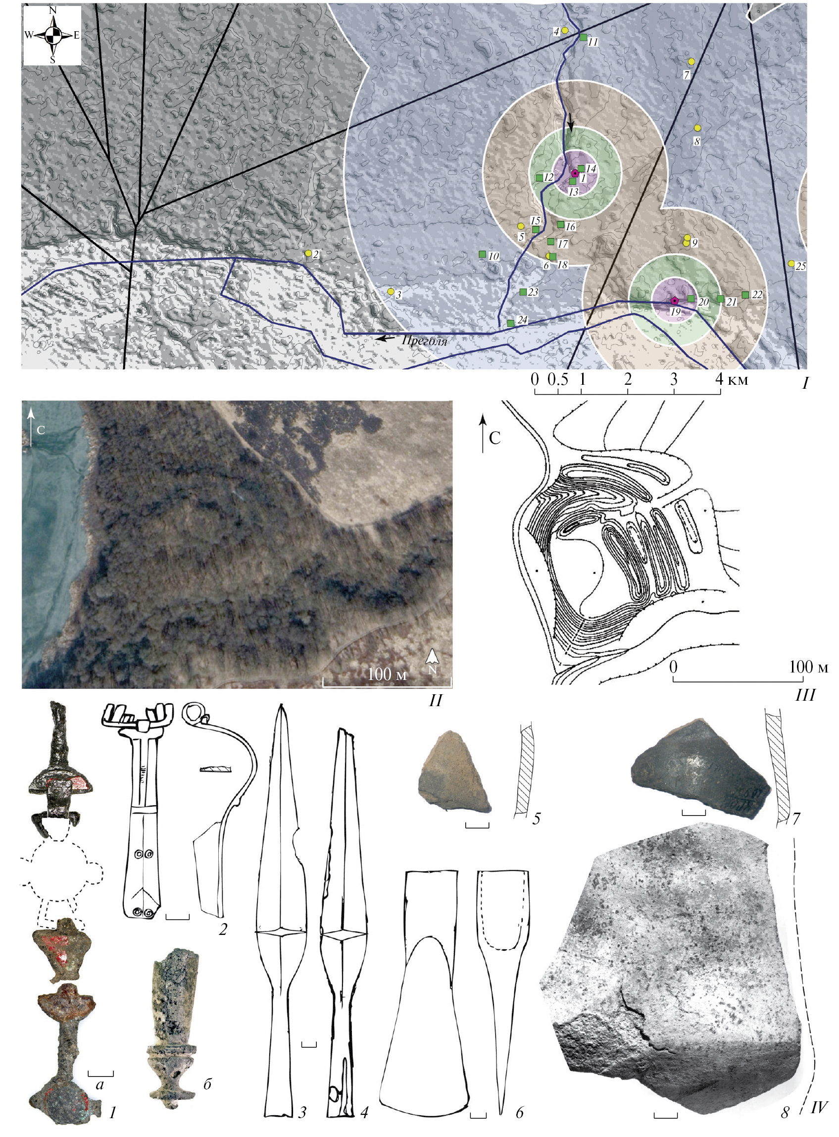 Рис. 3. Микрорегион у оз. Чистый Пруд: I – Модель центра расселения (1 – Заозерье/Rodmannshöfen; 2 – Ялтинская улица/Kupferberg; 3 – Октябрьский/Liep; 4 – Кумачево/Tropitten; 5 – Большое Исаково/Lauth; 6 – Заозерье/ Lapsau; 7 – Авангардное/Dossiten; 8 – Поддубное/Neidtkeim-Fürstenwalde; 9 – Родники 1/Käpphen bei Preußisch Arnau; 10 – Большое Исаково 1; 11 – Кумачево; 12 – Большое Исаково; 13 – Заозерье 2; 14 –Заозерье 1; 15 – Большое Исаково 2; 16 – Заозерье 3; 17 – Заозерье 4; 18 – Заозерье 5; 19 – Марьино/Arnau; 20 – Родники 1; 21 – Родники 2; 22 – Солнечное; 23 – Прибрежное 1; 24 – Прибрежное 2; 25 – Солнечное/Praddau; II–IV – городище Заозерье: II – космоснимок; III – топоплан; IV – находки из округи городища (1, а, б – цепь и наконечник рога для питья; 2 – “глазчатая” фибула; 3, 4 – копья; 5, 7, 8 – фрагменты лощеных лепных сосудов; 6 – топор (1–4, 6 – по: Хомякова, 2013; 5, 7, 8 – © Калининградский областной историко-художественный музей).