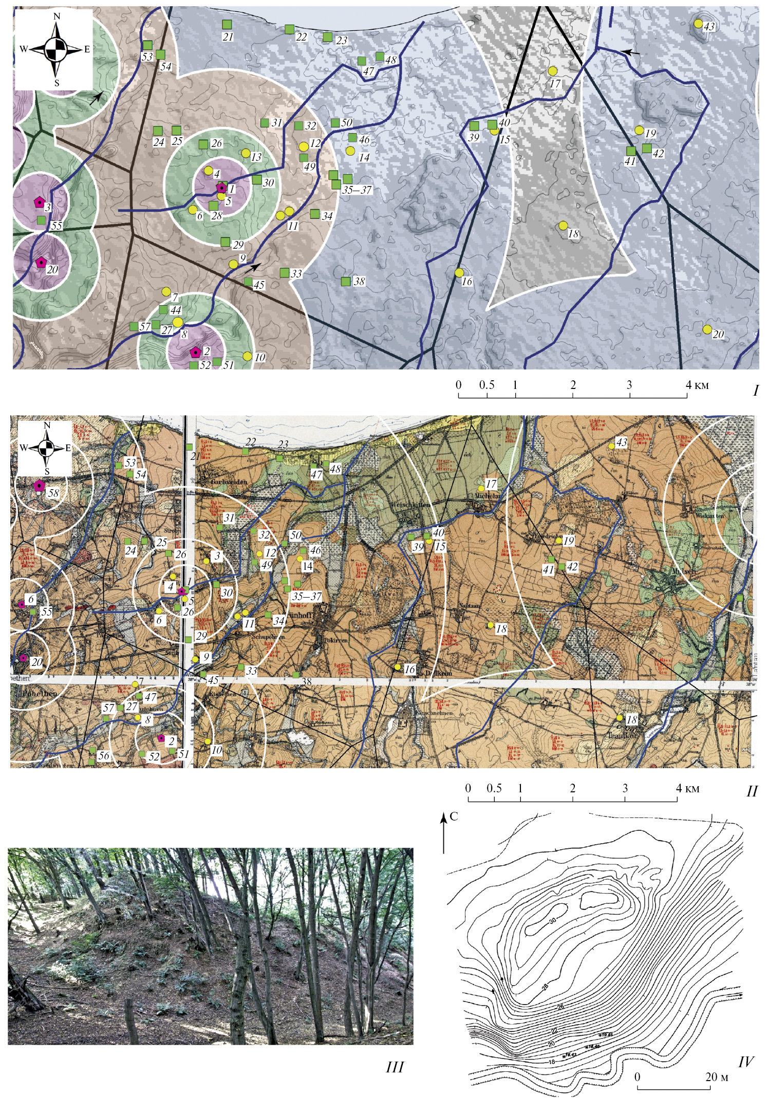 Рис. 5. Микрорегион на севере Самбии в районе реки Алейка: I – модель центра расселения; II – расположение памятников в пределах 5 км буферных зон городищ (1 – Куликово/Kringitten; 2 – Геройское/Eisliethen; 3 – Романово 2/Diewens; 4 – Куликово 1; 5 – Куликово 2/Sorthenen; 6 – Сортьенен 1, 3; 7 – Алейка 3; 8 – Алейка 7; 9 – Шумное; 10 – Айслиттен I–II; 11 – Шумное 2–3; 12 – Рощино 1; 13 – Куликово 2/Strobjehnen; 14 – Шумное 1; 15 – Коврово/Nautzau; 16 – Коврово/Dollkeim; 17 – Михелау; 18 – Наутцау-Кадигсберг; 19 – Каменка; 20 – Трансау, 21 – Куликово 3; 22 – Куликово 4; 23 – Береговое; 24 – Куликово 8a; 25 – Куликово 8; 26 – Куликово 5; 27 – Алейка 1; 28 – Куликово 6; 29 – Куликовo 1; 30 – Куликово 2, 2а; 31 – Куликово 9; 32 – Куликово 7; 33 – Шумное 4; 34 – Шумное 1; 35–37 – Шумное 2–4; 38 – Рощино; 39 – Коврово 4; 40 – Коврово 2; 41 – Коврово 3; 42 – Сиренево; 43 – Кунтерштраух; 44 – Алейка 2; 45 – Шумное 6; 46 – Рощино 1; 47 – Береговое 2; 48 – Береговое 1, 3; 49 – Куликово 12; 50 – Куликово 6; 51, 52 – Зольное 1, 2; 53, 54 – Хелле 1, 2; 55 – Романово 1; 56 – Геройское 5, 6; 57 – Алейка 5; 58 – Заостровье); III – городище Айслиттен, фото; IV – городище Куликово/ Kringitten, топоплан (III, IV – по: Вокруг кольца, 2021. Рис. 4, 11).