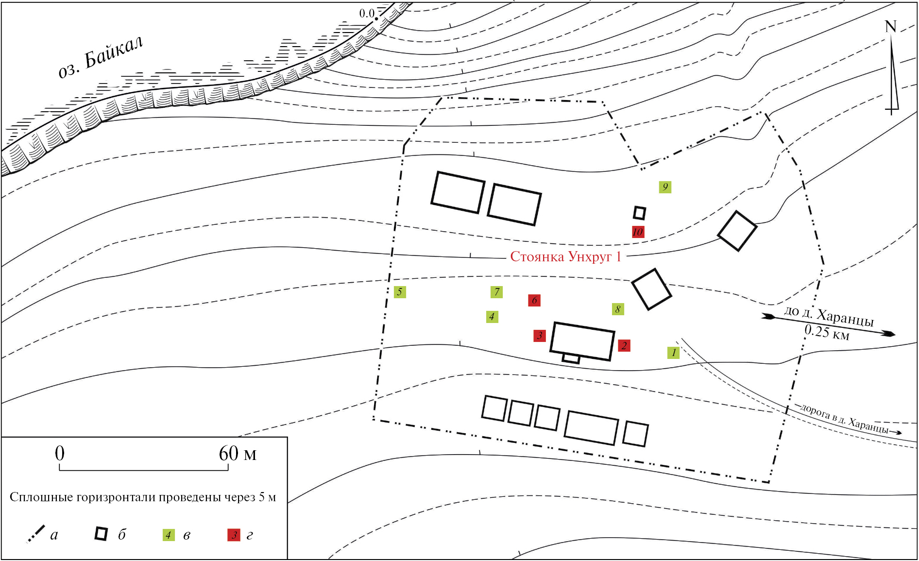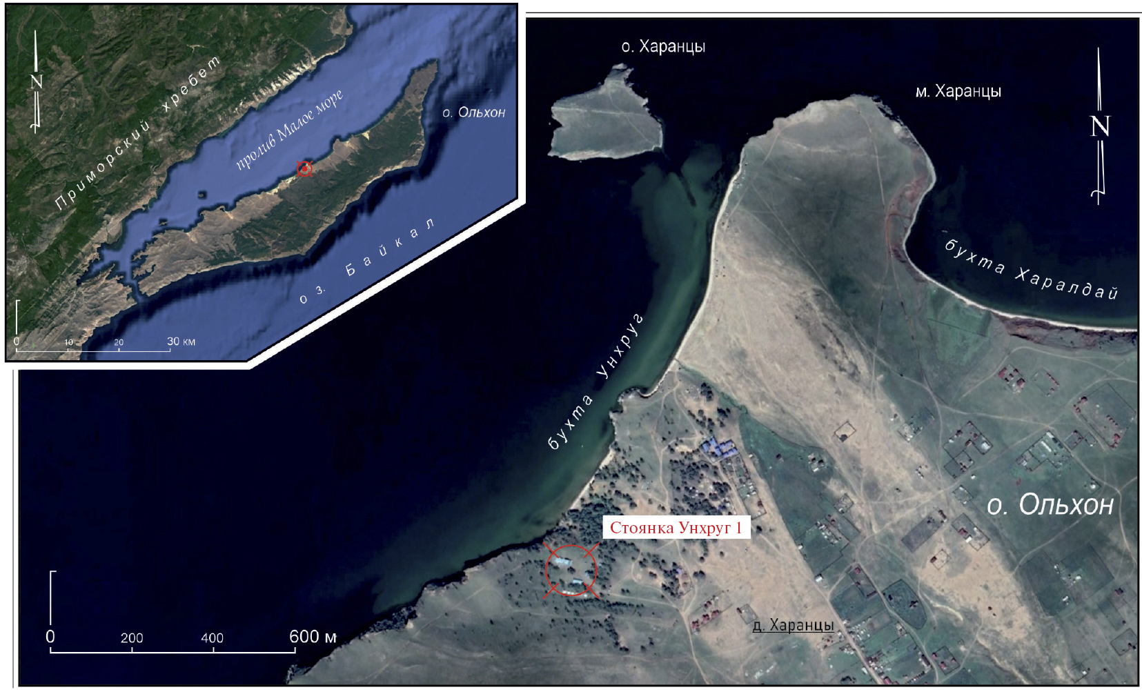 Стоянка Унхруг 1 расположена в юго-западной части одноименной бухты, в 0.25 км к западу от современной застройки д. Харанцы, и локализуется на террасовидных площадках пологого склона берега, на отметках 28–40 м над уровнем воды в оз. Байкал (рис. 1, 2).