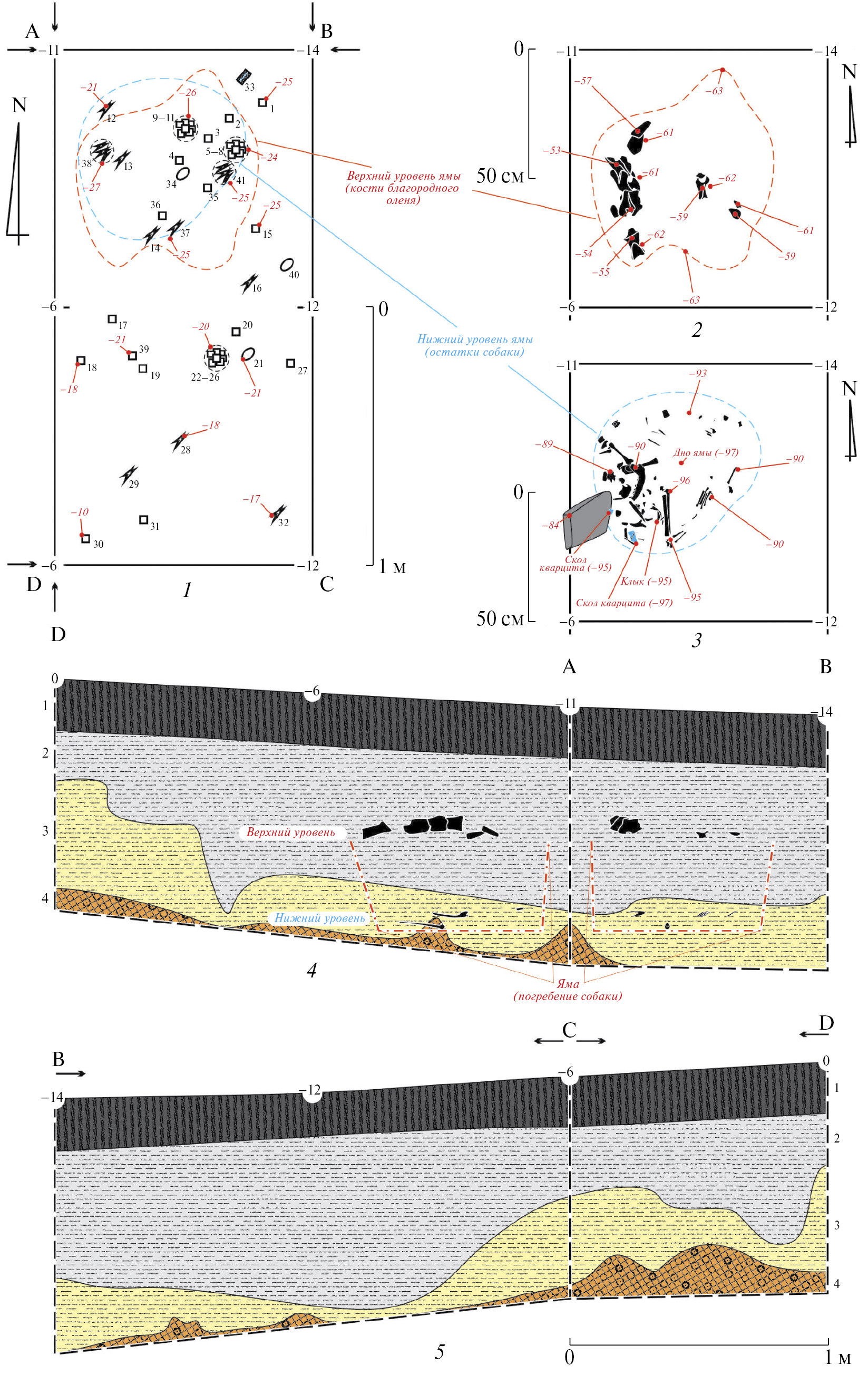 Рис. 3. Стоянка Унхруг 1, шурф 3. 1 – планиграфия находок; 2 – верхний уровень заполнения ямы (кости благородного оленя); 3 – нижний уровень заполнения ямы (погребение собаки); 4, 5 – стратиграфия бортов шурфа.