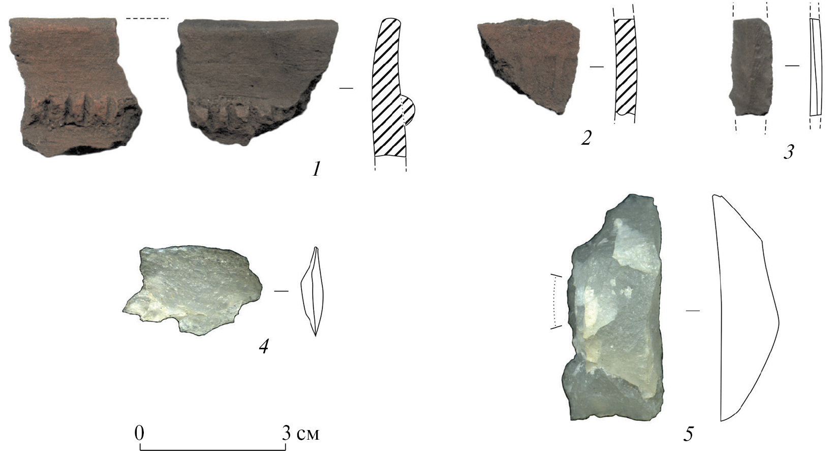 Рис. 4. Археологический материал шурфа 3. 1–3 – 1-й культурный слой; 4, 5 – 2-й культурный слой (нижний уровень заполнения ямы).