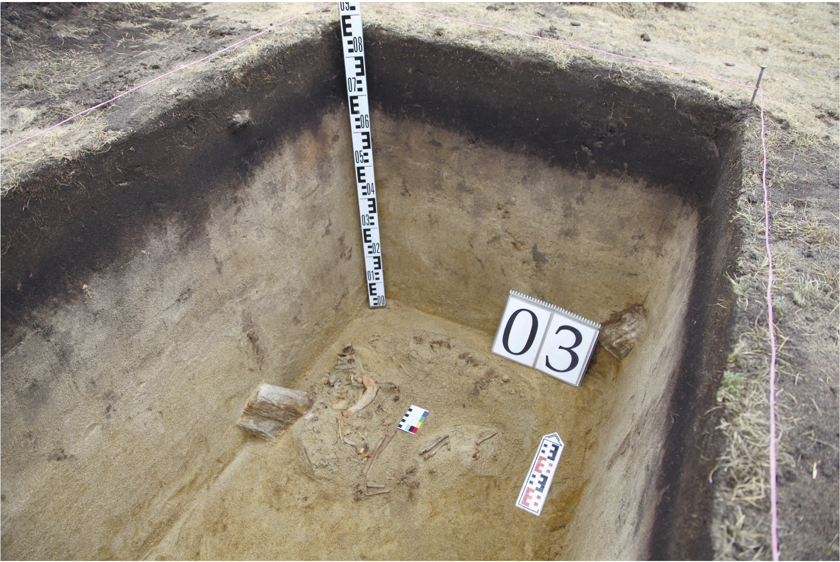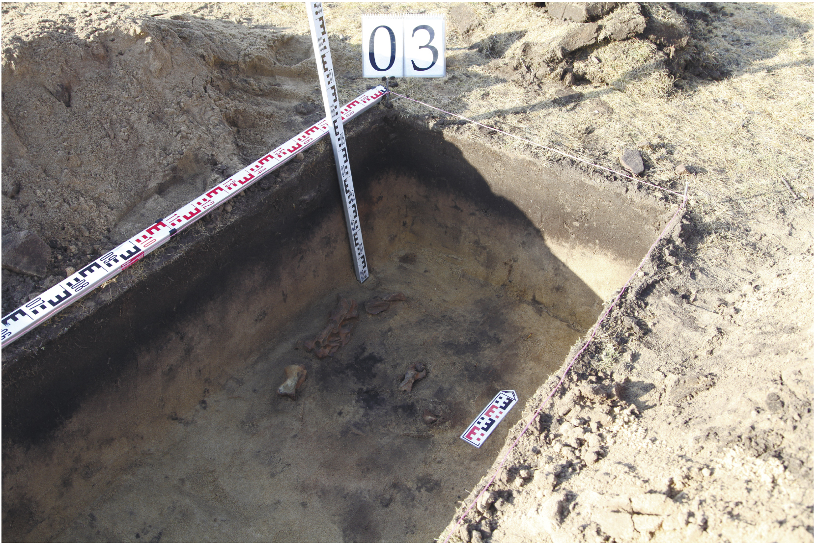 Fig. 6. The Unkhrug 1 site, test pit 3. The lower level of the pit filling (remains of a dog), south-southeast view