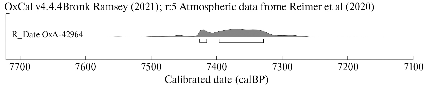 По кости собаки получена радиоуглеродная дата 6730±23 лет назад, далее л.н. (OxA-42964), которая с учетом поправки на резервуарный эффект соответствует дате 6470±46 л.н., а после калибровки в программе OxCal v4.4.4. – возрасту 7426–7329 л.н. (68.3% достоверности) (рис. 7). В данном случае для поправки на резервуарный эффект использовано уравнение, разработанное для Верхней Лены, так как измерения по стабильным изотопам углерода и азота (δ13C = –19.2‰, δ15N = 11.1‰) указывают на рацион питания унхругской собаки, характерный не для населения Приольхонья, что примечательно, а как раз для групп неолита и бронзового века соседнего района Верхней Лены (Reimer et al., 2020; Bronk Ramsey, 2021; Schulting et al., 2022).