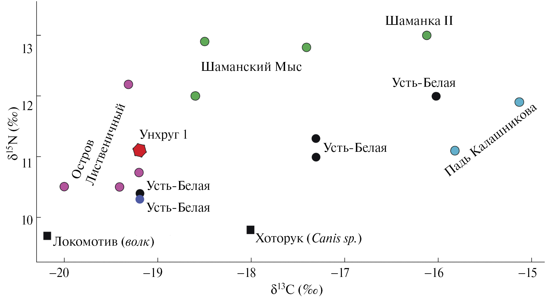 Проанализированные данные приводят к выводу, что унхругская собака в последние годы жизни питалась преимущественно продуктами охоты на копытных, с возможной примесью рыбы, рыбоядной птицы или мяса хищников. Сходство изотопных сигналов δ15N унхругской собаки, собак наземных охотников (рис. 8), неолитического населения верховий Лены, приводит к выводу о принадлежности изученной собаки к коллективам охотников на крупную дичь. Косвенное подтверждение этому – наличие остатков именно благородного оленя в качестве сопровождающей погребальной пищи в могильной яме.