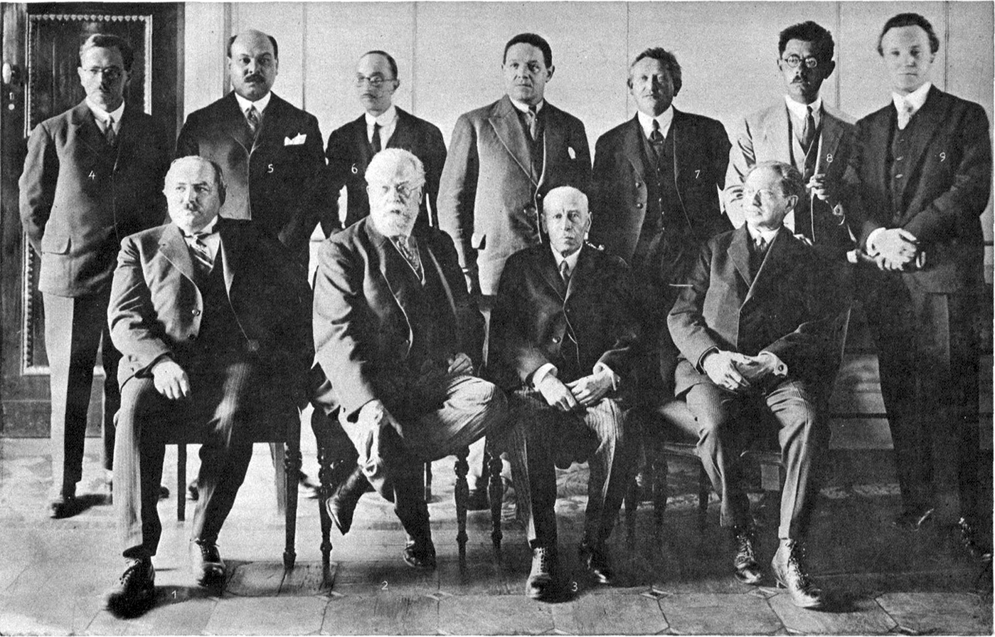 Рис. 3. Участники Международного археологического конгресса (Берлин, 1929 г.). Сидят (слева направо): Аксель Перссон (Уппсала), Анри Бегуэн (Тулуза), Хосе Рамон Мелида-и-Алинари (Мадрид), неизвестный; стоят (слева направо): Андраш Алфёльди (Дебрецен), Эмиль Панайтеску (Бухарест), Джузеппе Лугли (Рим), неизвестный, Гуго Обермайер (Мадрид), Элеазар Липа Сукеник (Иерусалим), Борис Жуков (Москва). Сверху дочь Б.С. Жукова оставила надпись: “Отец. Крайний справа на праздновании Берлинского археологического института”. Фото из газеты Цайтбилдер 28 Апреля 1929.