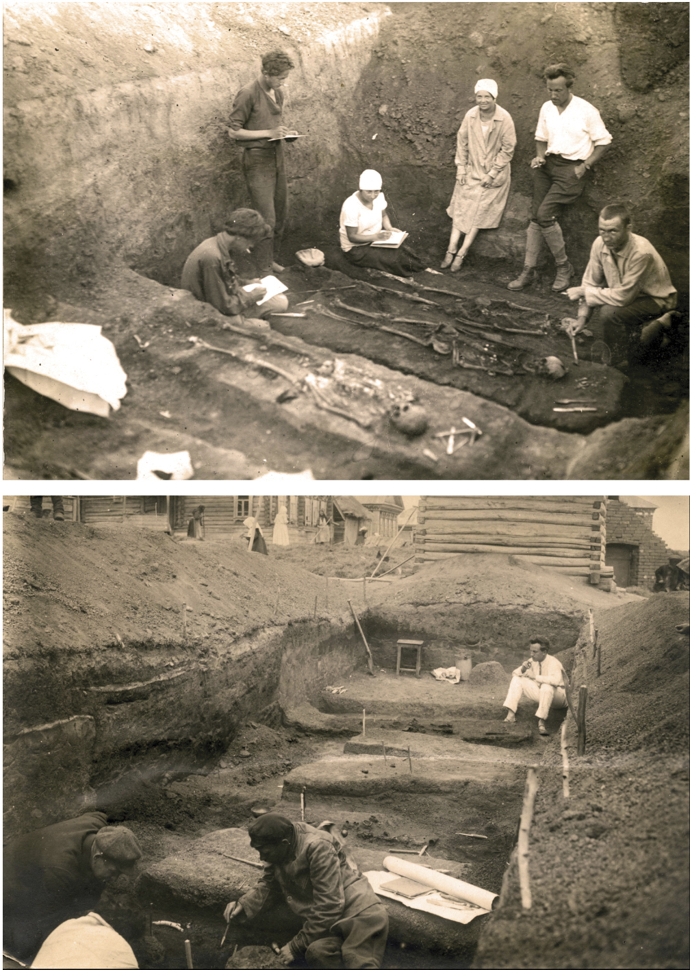 Fig. 4. Excavations of the Peremchalka burial ground. In the top photo, B.S. Zhukov is standing on the right, on the bottom photo, he sitting in the background. Anthropological complex expedition, 1926