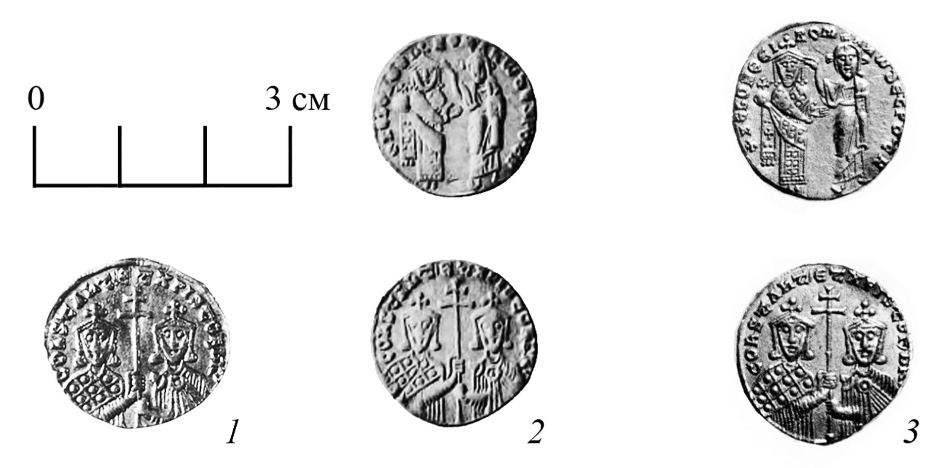 Византийская золотая монета – солид, обрезана по нижнему краю (рис. 2, 1). В “Отчете…” приводится следующее его династийное определение: “имп. Романа I, Константина X и Христофора (920–944)” (Отчет..., 1918. С. 196). Позднее Г.Ф. Корзухина исправила явную ошибку: Роман I, Константин VII и Христофор с датировкой 921–944 гг. (Корзухина, 1954. С. 86. № 20).