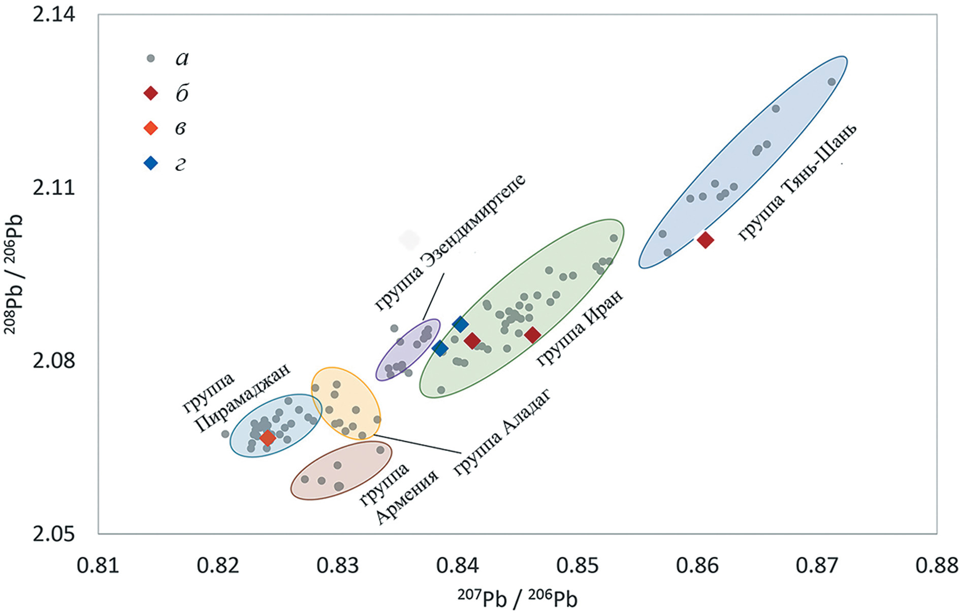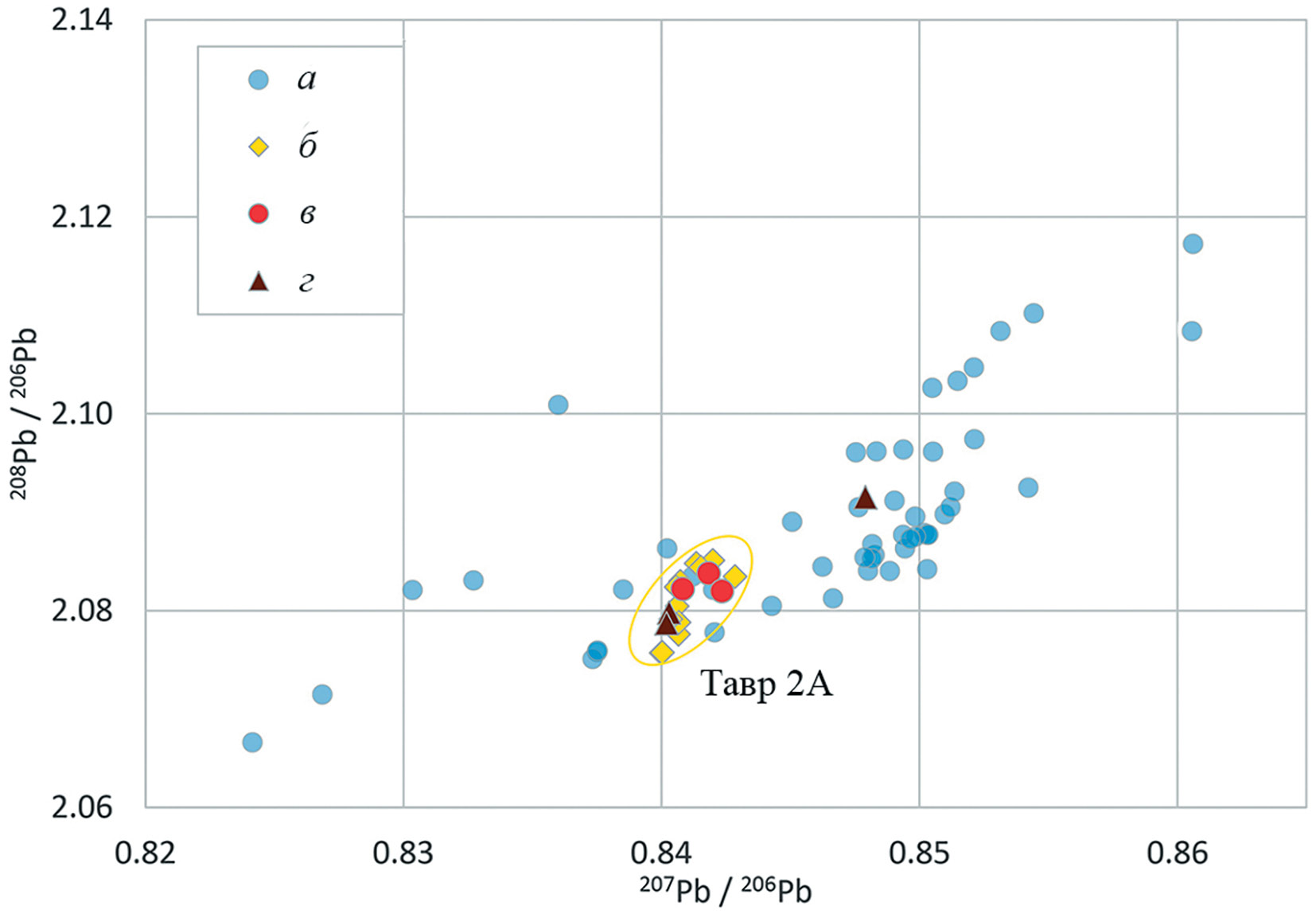 Рис. 3. Сравнение византийских серебряных монет с рудами Таврских гор (Тавр 2А). Условные обозначения: а – предметы из серебра (Ополье и Муром); б – руды гор Тавра 2А; в – милиарисии (Ополье); г – милиарисии (Хедебю).