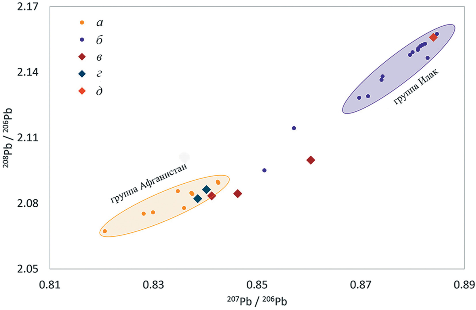 Близкие значения обнаруживают месторождения гор Гиндукуша (Stacy et al., 1980; al-Ganad et al., 1994; Merkel, 2016), что позволяет их рассматривать в качестве возможного источника серебра для изготовления дирхама. Однако из-за ограниченности справочных данных этот вывод требует дальнейшего подтверждения. Фрагменты дирхамов (№ 14, 15) содержат висмут и имеют изотопные отношения свинца, соответствующие иранским дирхамам Аббасидов (рис. 4) и дирхамам Саманидов из Северного Афганистана: Балха и Андарабы (рис. 5).
