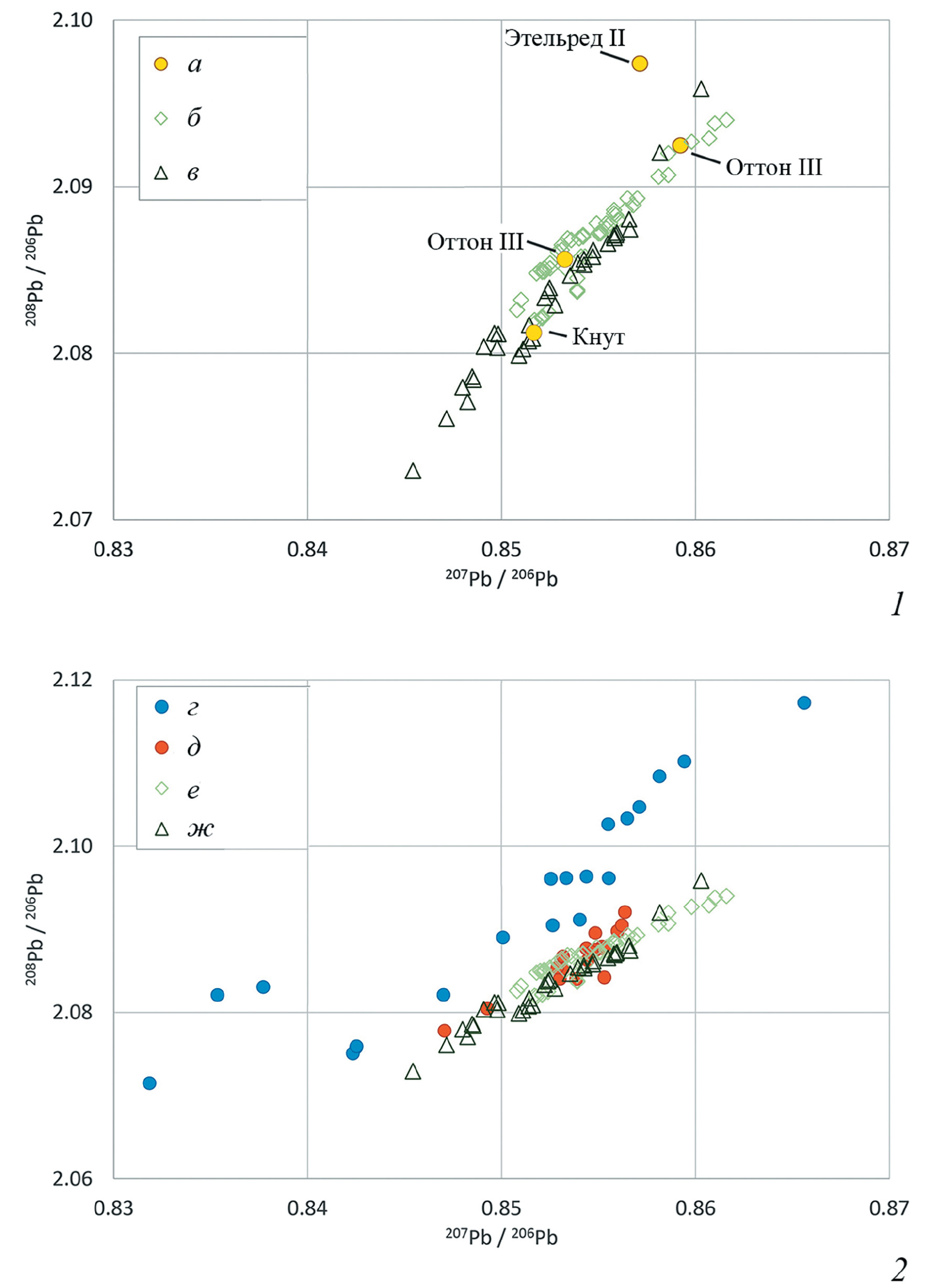 Повышенные уровни висмута фиксируются в металле, поступавшем из контролируемых Саманидами регионов Центральной Азии и Афганистана в X в. (Ениосова, Митоян, 2011. С. 93). В этом серебре, как правило, содержание 208Pb/206Pb по отношению к 207Pb/206Pb выше, чем в европейском металле X–XI вв. (Merkel, 2016). На рис. 6, 2 восточное серебро не только отображается на отдельной линии тренда выше европейского серебра, но и демонстрирует значительно больший диапазон отношений изотопов свинца.