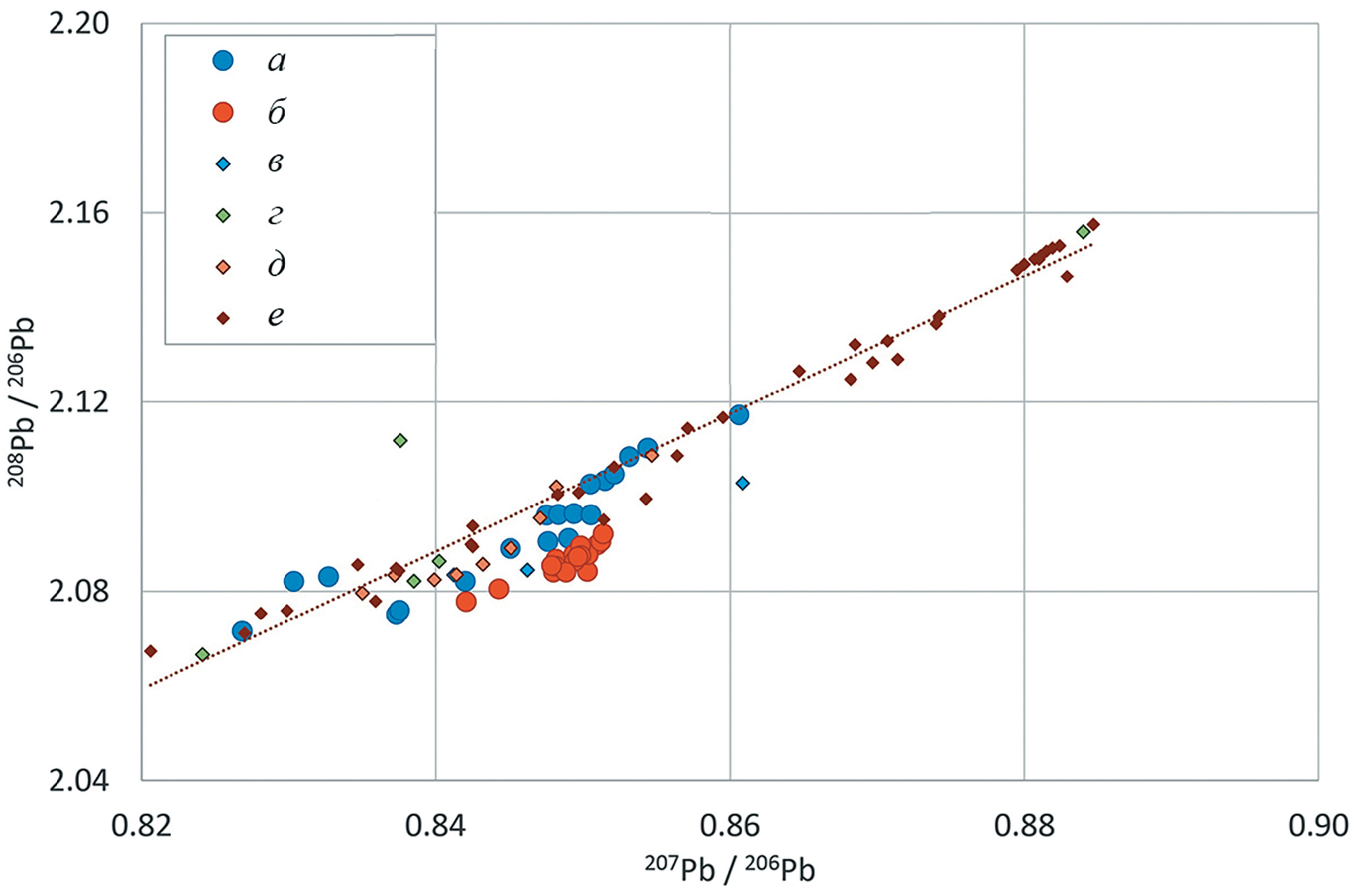 Масс-спектрометрические измерения изотопных отношений свинца выполнены на многоколлекторном масс-спектрометре NEPTUNE (Чернышев и др., 2007). Анализ проводился в режиме “wet plasma” для растворов образцов, трассированных таллием (Tl). Корректирование эффекта приборной масс-дискриминации осуществлялось по результатам измерения опорного отношения 205Tl/203Tl, которое принималось равным 2.3889±1. Погрешность измерения оценивалась по долговременной воспроизводимости результатов анализа стандартного образца Pb SRM 981 (n=11) и образца горной породы AGV-2 (n=4). Величина аналитической погрешности для отношений 206Pb/204Pb, 207Pb/204Pb и 208Pb/204Pb не превышала ±0.03% (2SD).