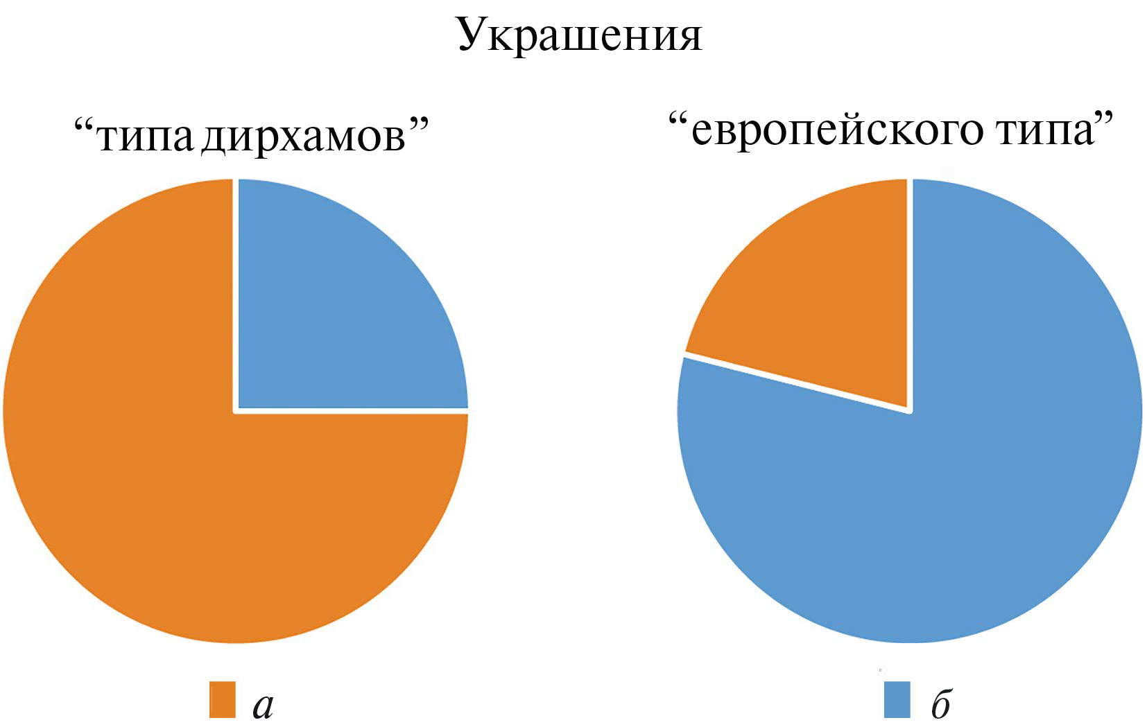 Fig. 8. Groups of silver jewellery (Opolye and Murom), with bismuth in the metal (a) and without it (б)