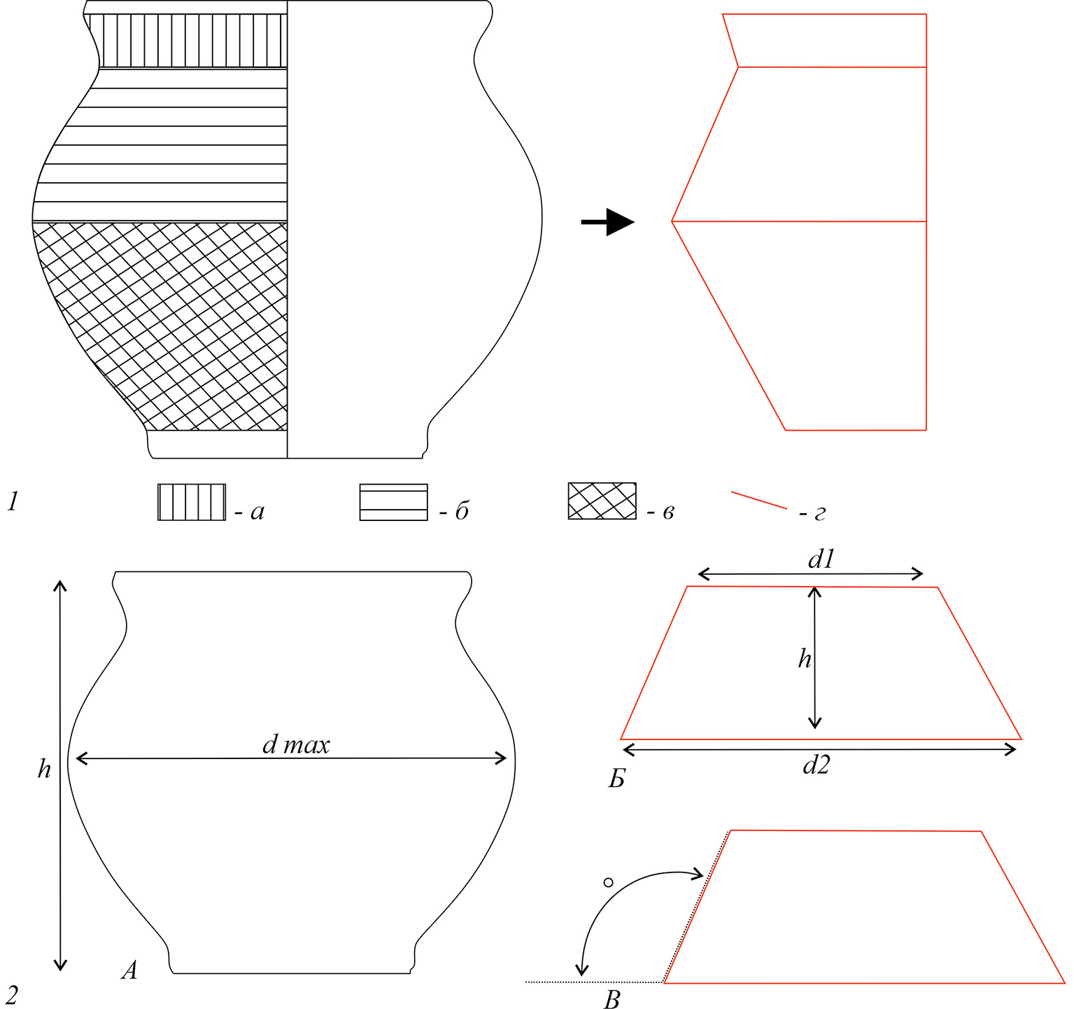 Рис. 1. Методика исследования: 1 – функциональные части, подвергнутые анализу (условные обозначения: а – щека-шея, б – плечо-предплечье, в – тулово, г – костяк сосуда); 2 – исследуемые параметры форм сосудов: А – общая пропорциональность, Б – пропорциональность функциональной части, В – угол наклона боковой линии костяка функциональной части.