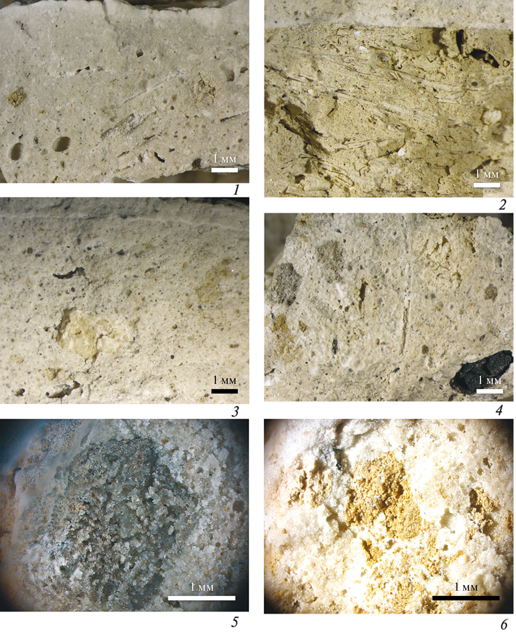 Рис. 2. Микрофотографии формовочной массы сосудов из гипса, сделанных по налепочной технологии (1, 3–6), и керамического сосуда, покрытого гипсом (2): 1 – гипсовый сосуд (образец № 18); 2 – гипсовая обмазка сосуда из глины (образец № 6); 3, 5 – гипсовый сосуд с примесью угля и глины (образец № 9); 4, 6 –гипсовый сосуд (образец № 19); 1, 2, 4 – отпечатки очень мелкой растительности, связанной с навозом; 3, 4, 6 – включения глины; 4, 5 – более крупные включения гипса; 4 – включения угля; 1–4 – оптический микроскоп Leica MZ7.5; 5, 6 – модульный микроскоп ADF W300.