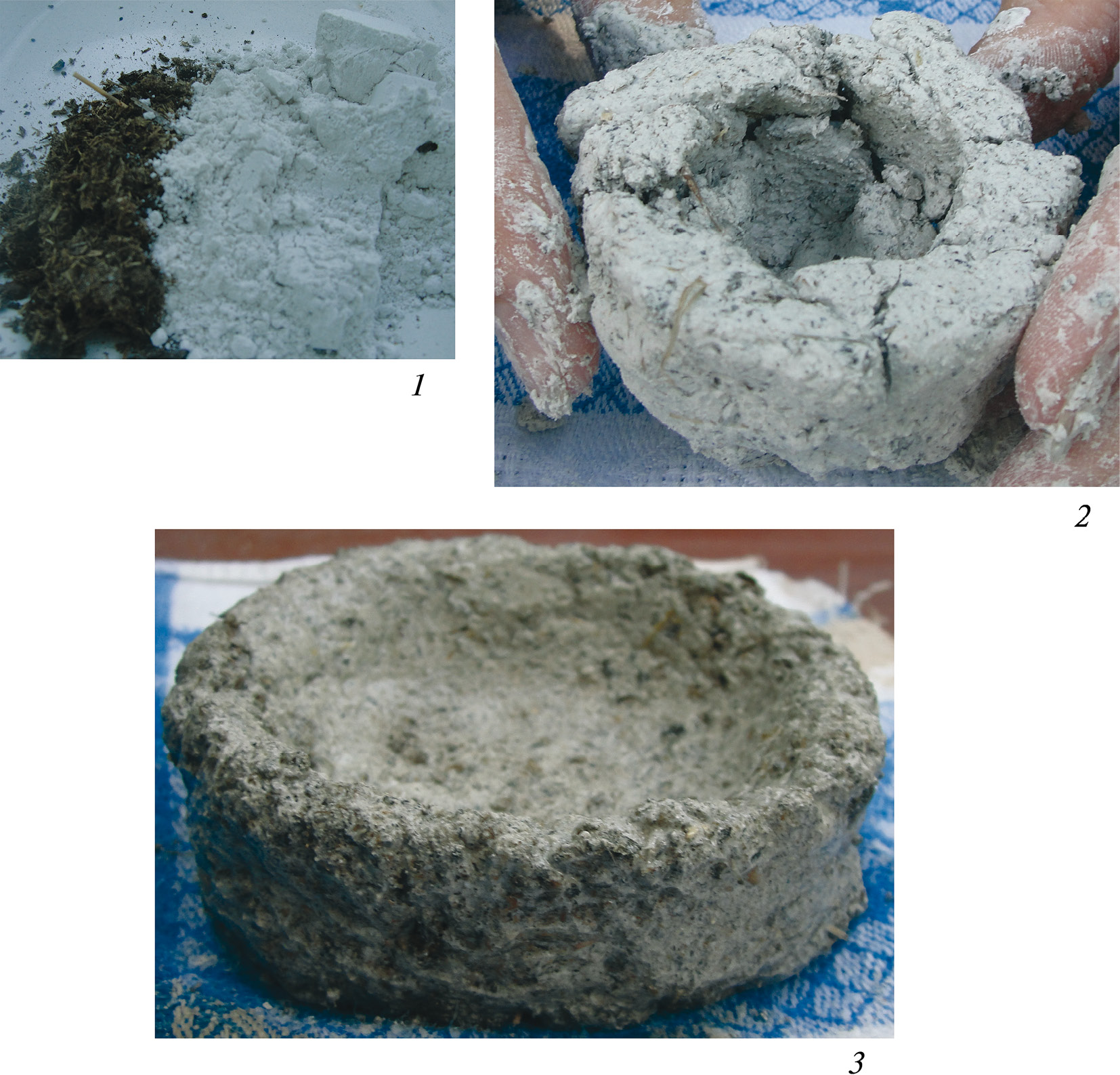 Данные эксперимента по изготовлению сосуда из гипса. Кроме того, для понимания возможностей использования налепочной технологии при использовании гипсовой смеси в 2018 г. Петровой Н.Ю. проводился эксперимент3, в ходе которого были произведены попытки изготовления небольших сосудов из чистого гипса и гипса с добавкой сухого навоза коровы. Такой состав был выбран в связи с тем, что в изучаемый период навоз являлся наиболее распространенной примесью при изготовлении керамических сосудов (Петрова, 2019; Petrova, 2024). Необходимо отметить, что успешно удалось изготовить сосуд из гипса с помощью лоскутной налепочной технологии только после добавления туда примеси навоза в концентрации 30% (рис. 5).