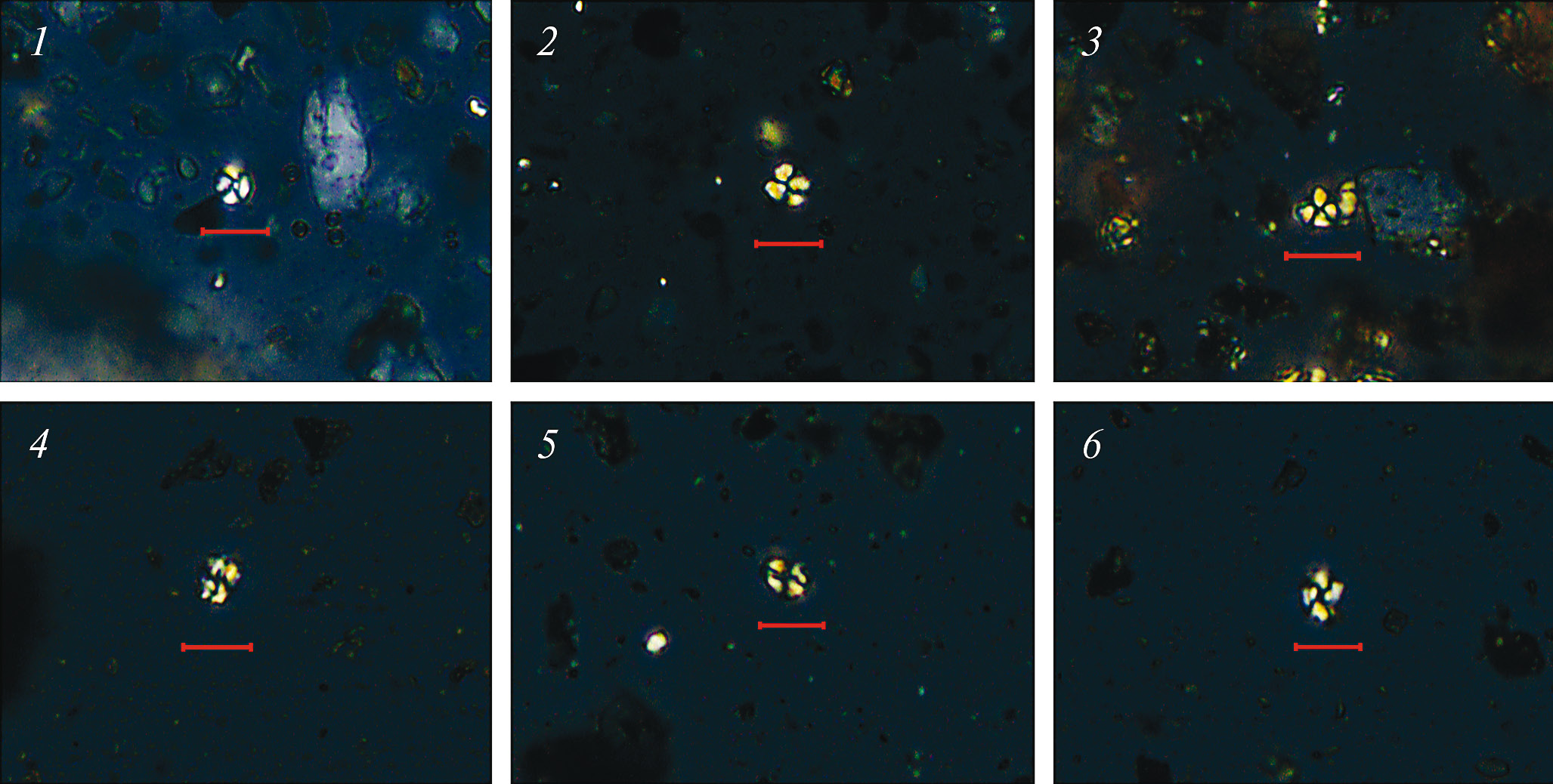 Рис. 6. Сферулиты в кросс-поляризованном свете из гипсовых (1, 2) и глиняных (3–6) сосудов. Масштабный отрезок 10 мкм.