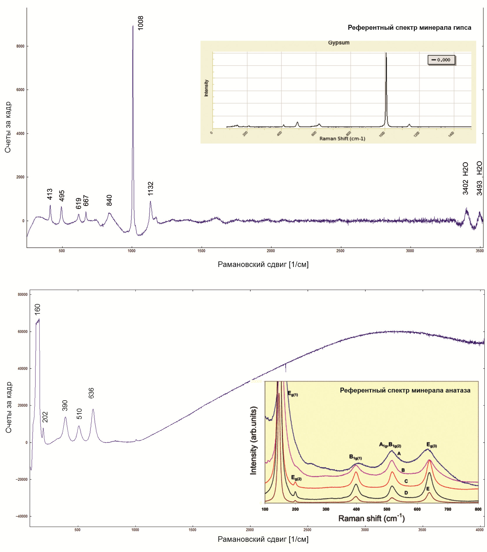 Рис. 7. Результаты рамановской спектроскопии: 1 – рамановский спектр гипса (формовочная масса, образец № 9) (Kuznetsov et al. 2005. Fig. 1); 2 – рамановский спектр анатаза (TiO₂) (формовочная масса, образец № 19) (RRUFF Database).