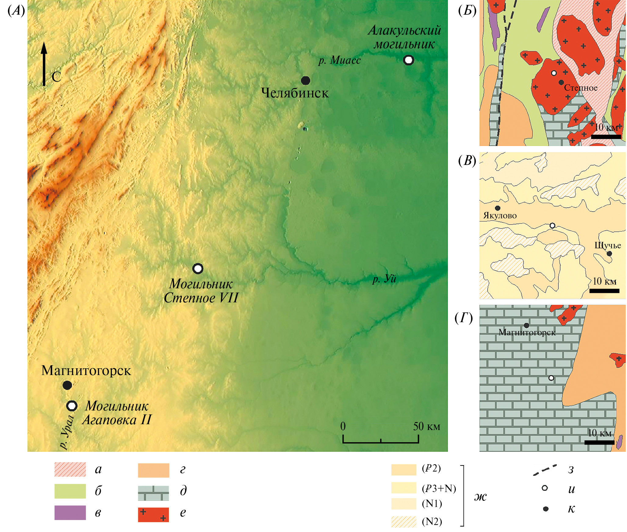 Рис. 1. Карта расположения алакульских памятников с фрагментами текстиля (А) и геологические схемы их окрестностей (Б – могильник Степное VII, В – Алакульский могильник; Г – могильник Агаповка II). Условные обозначения: а – метаморфические толщи (V); б – вулканогенно-осадочные толщи (O); в – ультрабазитовые массивы (O-D); г – вулканогенно-осадочные толщи (D) д – вулканогенные и карбонатные толщи (C); е – массивы гранитоидов (C-P); ж – осадочные породы: песчаники, конгломераты, алевриты, опоки, глины, пески; з – линии разломов, и – археологические памятники; к – современные города.