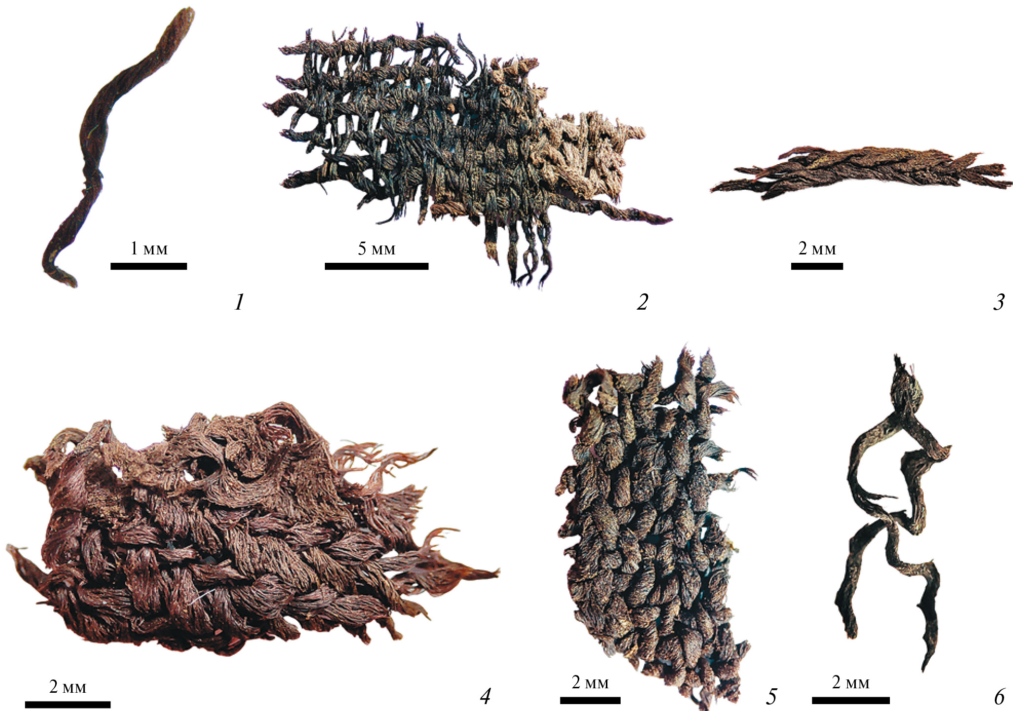 Рис. 2. Образцы текстиля из материалов могильника Степное VII (кург. 8, погр. 1): 1 – нить из ткани (шифр 6(5)); 2 – ткань (шифр 9); 3 – шнур из бронзовых бусин (шифр 10); 4 – тесьма (шифр 11); 5 – ткань (шифр 12); 6 – нити из тесьмы (шифр 13).