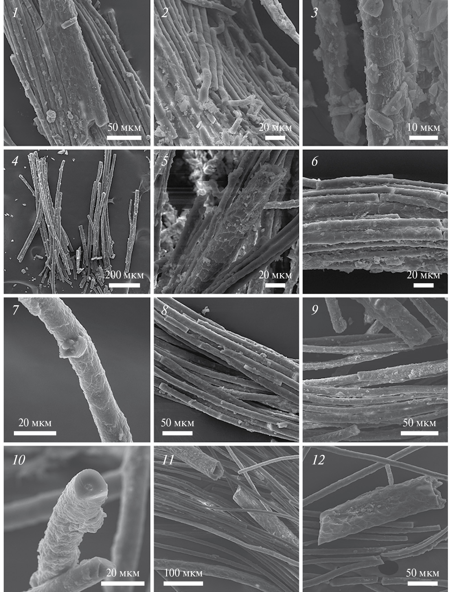 Рис. 5. Микрофотографии шерстяного волокна образцов из Алакульского могильника: 1, 2 – образец 1(8.1); 3–5 – образец 2(12); 6–8 – образец 3(10); 9, 10 – образец 4(14); 11, 12 – образец 5(13).