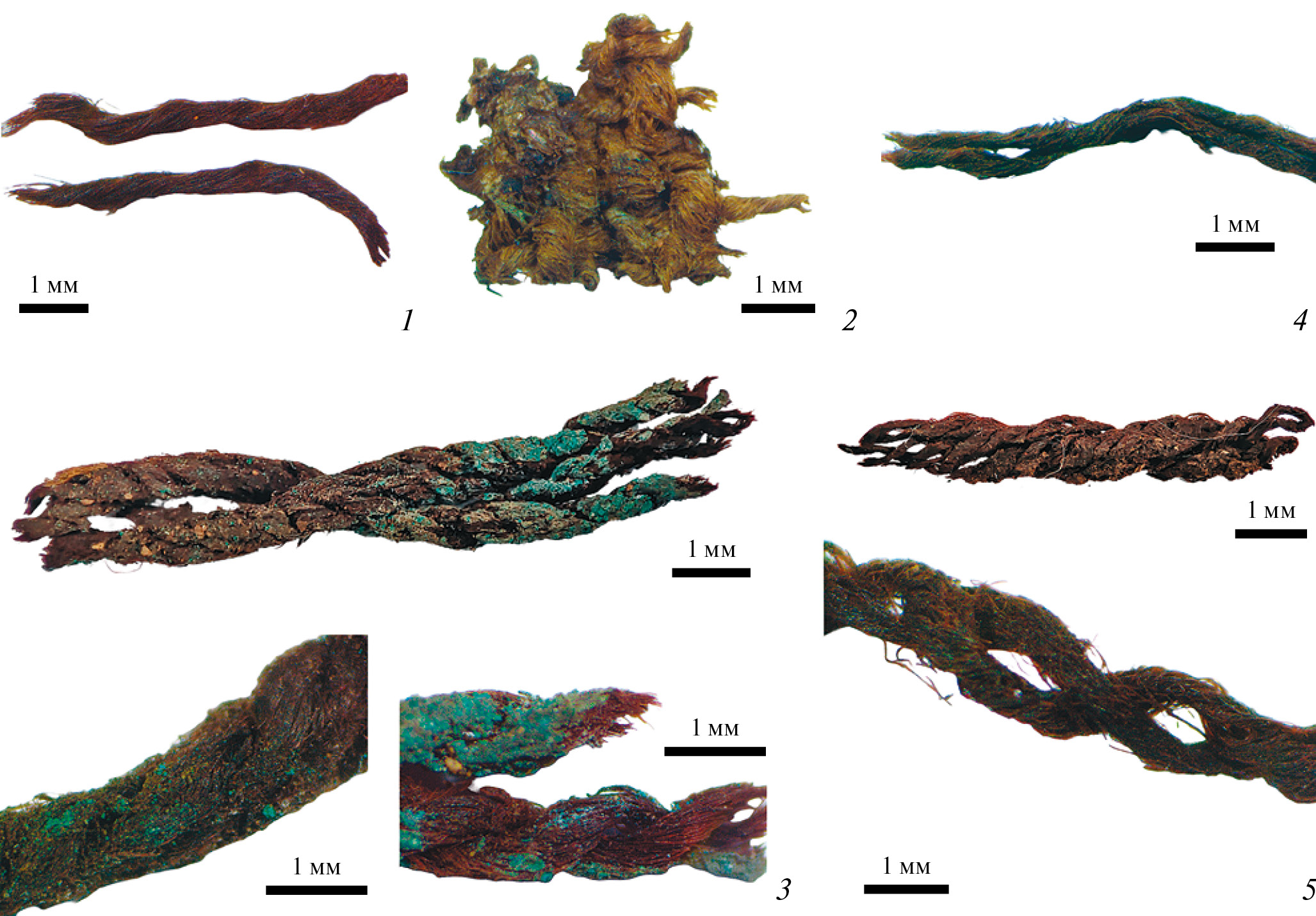 Курган 23, погребение 6. Могильная яма содержала скелеты плохой сохранности двух погребенных детей, возраст одного из них, предположительно, около полугода. Здесь найдены различные фрагменты текстильных изделий, сохранившиеся преимущественно на костях рук и ног, погребенных в контакте с бронзовыми предметами (Шилов, 2002). В нашу выборку вошли нити от двух шнуров из бронзовых и пастовых бус (рис. 4, 4-5; 5, 9-12).