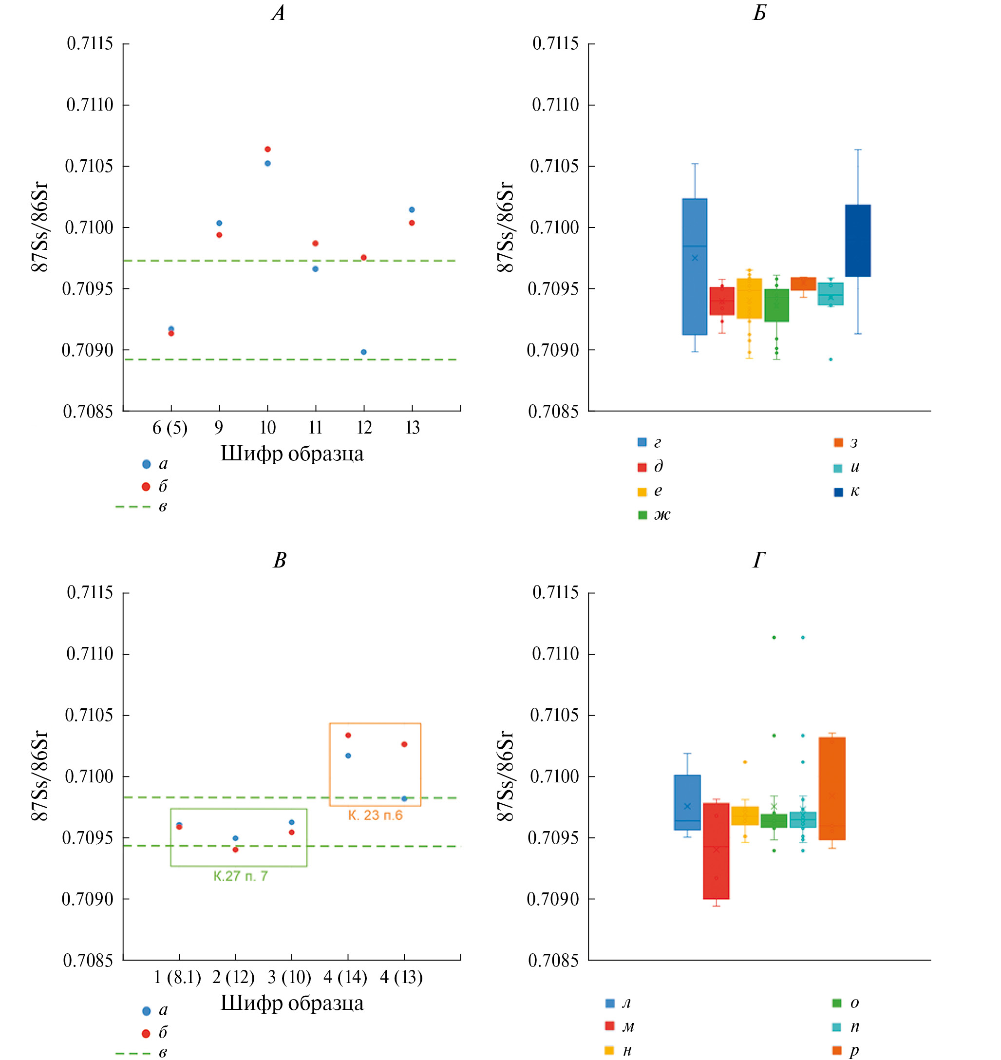 Рис. 8. Вариации изотопов стронция в материалах микрорайонов у с. Степное (А, Б) и могильника Алакульский (В, Г). Условные обозначения: А, В: а – промытый текстиль; б – смыв; в – границы возможного интервала фоновых значений; Б: г – текстиль (n=6); д – фон, радиус 5–7 км (n=9); е – фон, радиус 10–15 км (n=25); ж –поселение Степное, эмаль животных (n=21); з – могильник Степное-1, эмаль животных (n=5); и – поселение Степное, могильник Степное-1, эмаль МРС (n=14); к – смывы с текстиля ((n=6); Г: л – текстиль (n=5); м – локальный фон (n=4); н – могильник Алакульский, эмаль животных (n=10); о – могильник Алакульский, эмаль людей (n=16); п – могильник Алакульский, эмаль людей и животных (n=26); р – смывы с текстиля (n=5).