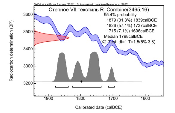 Для древностей Cтепного VII есть инструменты дополнительной верификации, так как две даты выполнены по текстилю (GrM-14460, 3479±19; IGANAMS-5648, 3440±25) и одна по коллагену из костей человека (IGANAMS-5647, 3380±25). Кроме того, предполагается, что алакульское погребение 1 было совершено позднее петровского погребения 2 (Куприянова, 2017а. С. 101), которое тоже имеет датировку (MAMS-32154, 3473±25). Результаты анализа текстиля в рамках процедуры R_Combine успешно проходят X²-тест и формируют дату 3465±16, калиброванный интервал которой 1879–1696 гг. до н.э. (95.4%) (рис. 7).