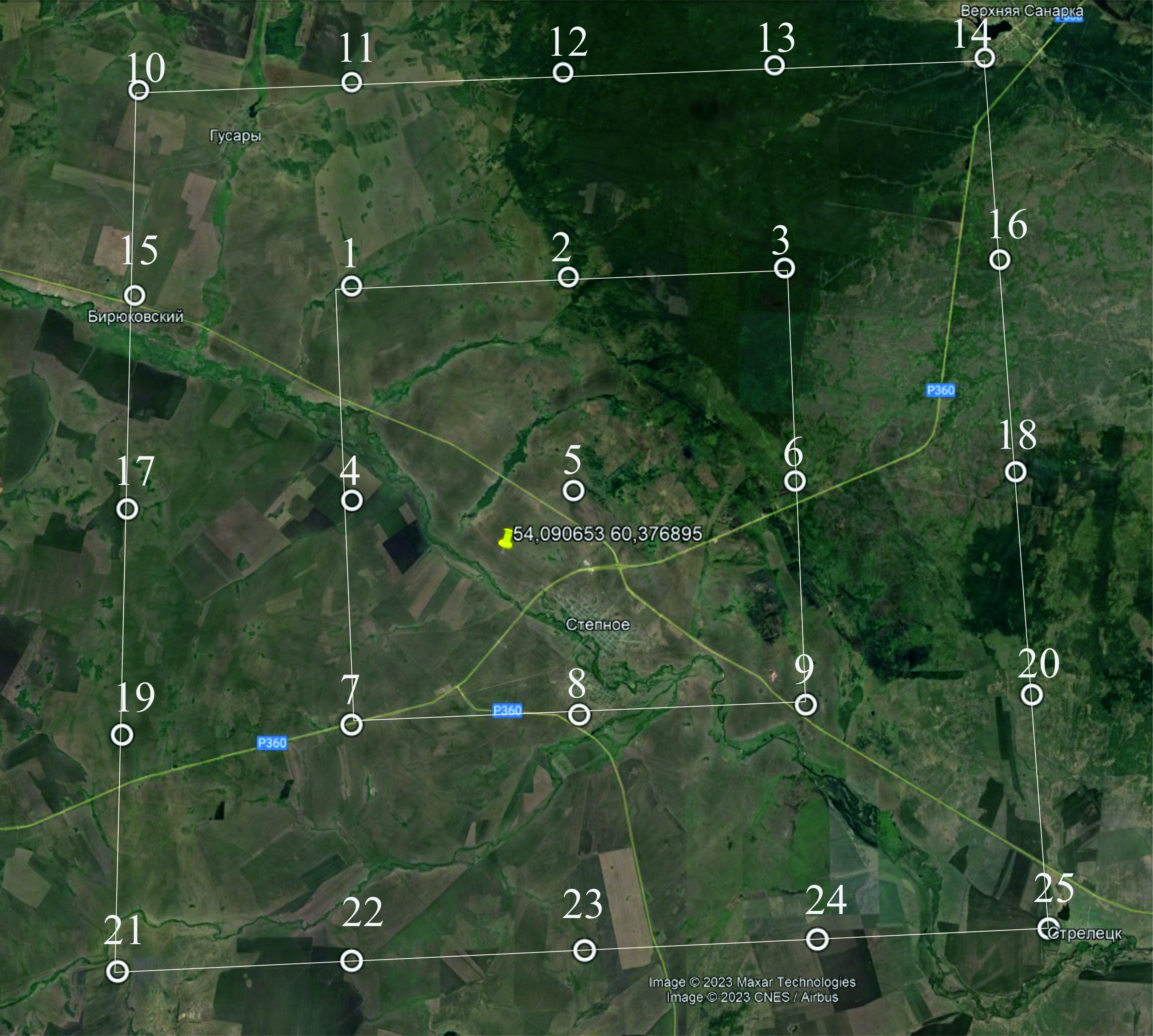 - – интерполированные фоновые значения ⁸⁷Sr/⁸⁶Sr в квадрате с длиной стороны 10 км (n=9), условным центром которого является могильник Степное VII. Таким образом, мы проверяем гипотезу о выпасе скота в радиусе 5–7 км от памятника;