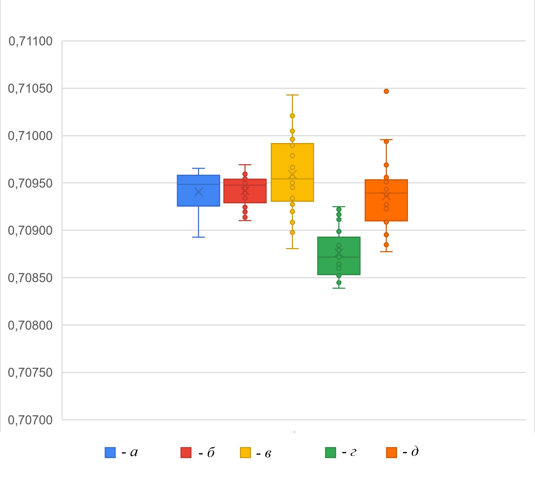 - – ввиду отсутствия на сегодняшний день карты интерполированных значений биодоступного стронция для Алакульского микрорайона мы используем значения ⁸⁷Sr/⁸⁶Sr, полученные в ходе непосредственных измерений локальных фоновых образцов, собранных в окрестностях памятника (вода, почва, раковины моллюсков (в том числе по: Шишлина и др., 2018, n=4);