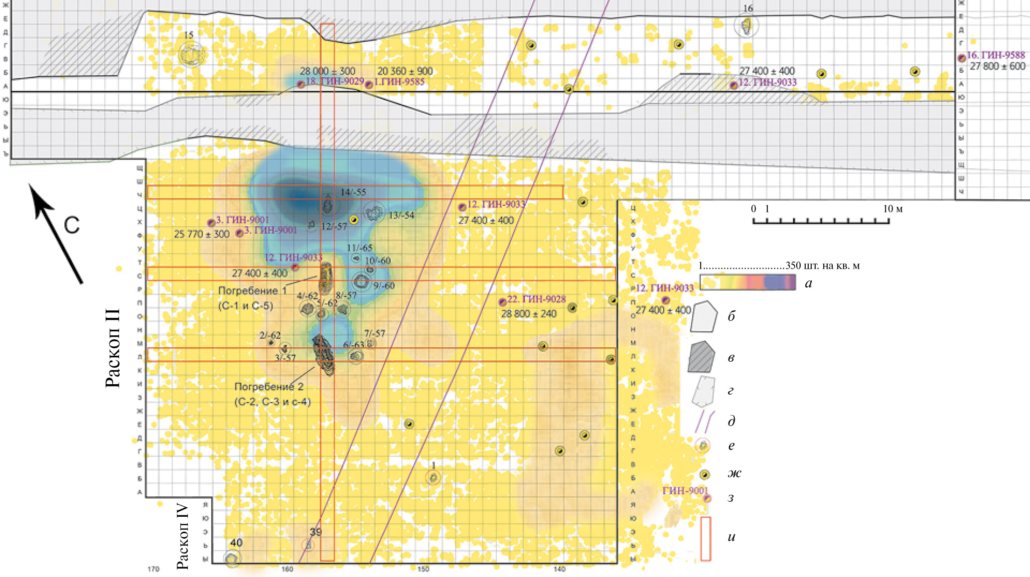 Рис. 1. Сунгирь, раскоп II и прилегающие участки. “Тепловая карта” плотности залегания находок, совмещенная с планиграфией объектов и образцов, по которым получены 14 С даты. Условные обозначения: а – плотность залегания находок; б – границы “забоев” экскаватора; в – участки частично сохранившегося культурного слоя; г – вероятные границы “забоев”; д – границы ложбины (по О.Н. Бадеру); е – яма; ж – скопление костей; з – образцы для датирования; и – линии профилей