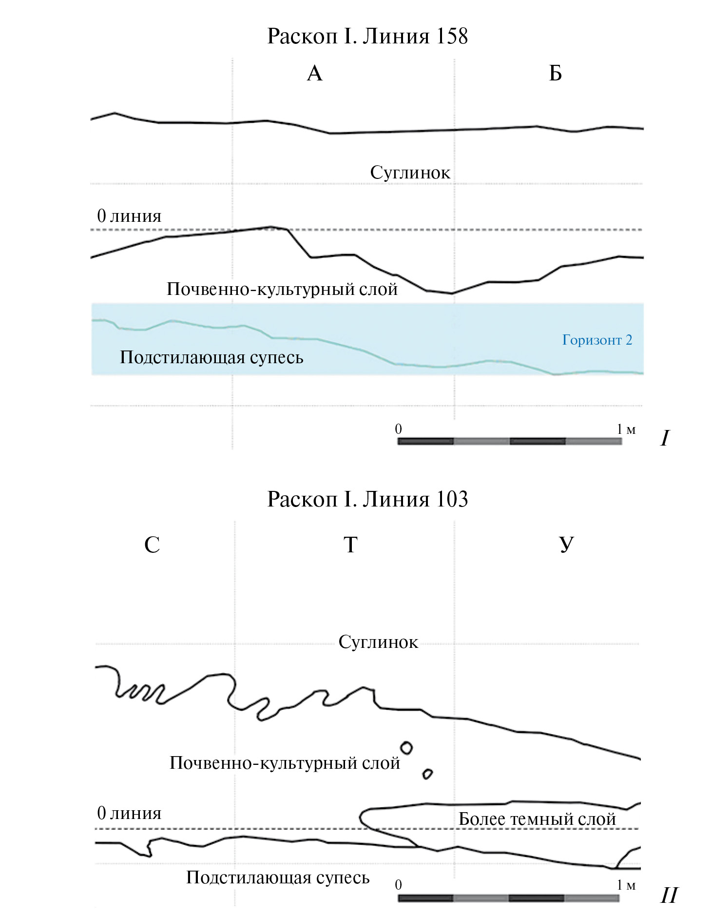 Первая дата, 28 000 ± 300 л.н. (ГИН-9029), получена по фрагменту бедренной кости мамонта. Образец залегал в горизонте 2 квадрата (далее – кв.) А/159 раскопа I. Данный квадрат вскрывался в 1966 г., культурный слой разбирался по трем условным горизонтам. В полевой документации О.Н. Бадера имеется разрез отложений, вскрытых в 1963 г. на линии квадратов 158 (рис. 2, I). Судя по характеру простирания погребенной почвы на участках кв. А-Б/158, условный горизонт 2 на линии А приходился на нижнюю половину почвенно-культурного слоя.