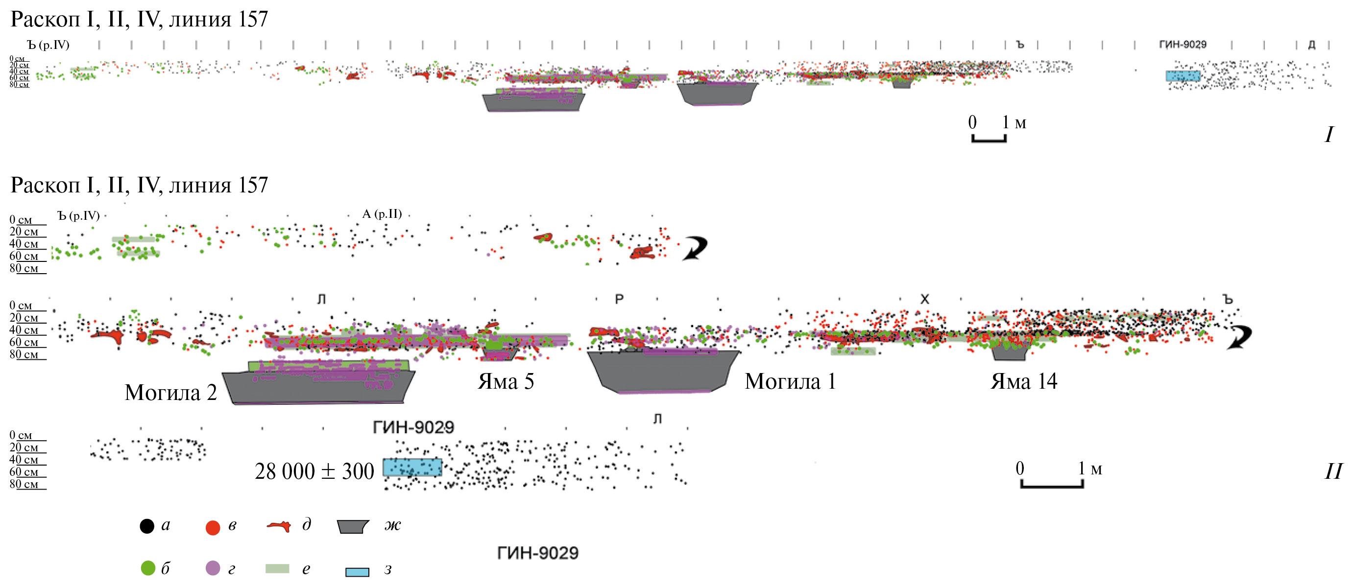 Рис. 3. Профиль по линии 157: I – общий вид; II – то же, крупный план. Условные обозначения здесь и на рис. 4–6: а – каменный инвентарь; б – уголь; в – кости; г – “охра”; д – крупные кости; е – гумусные и углистые пятна; ж – ямы и могилы; з – места отбора образцов