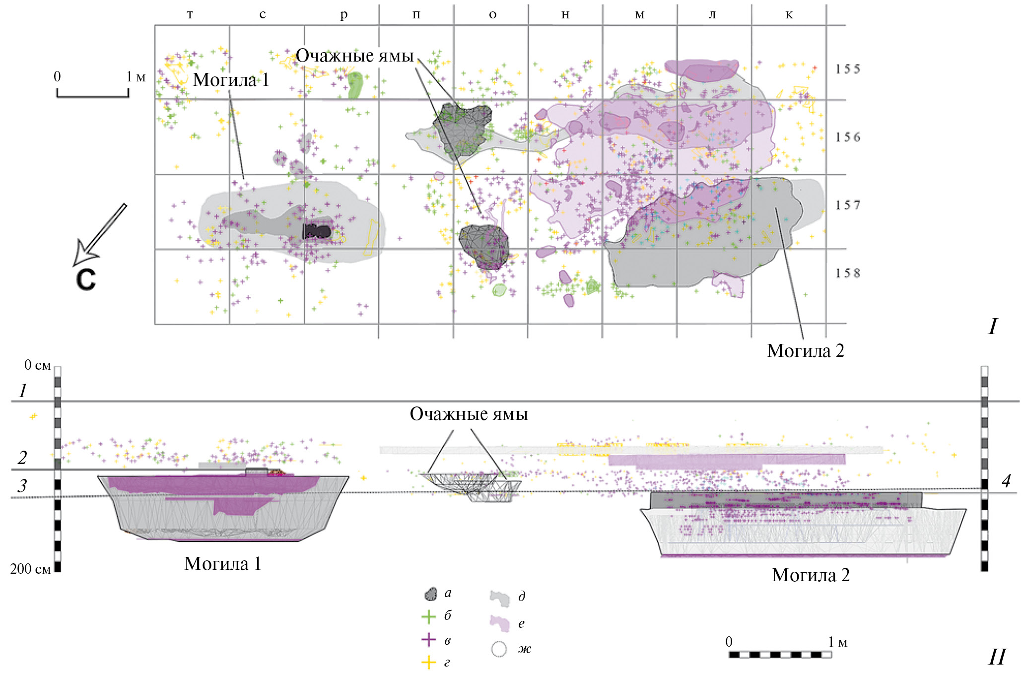 Рис. 7. Археологический контекст погребений: I – план; II – профиль. Условные обозначения: а – очаги; б – уголь; в – “охра”; г – кости; д – гумусированный слой; е – “охристый” слой; ж – контуры могил; 1 – верхняя граница горизонта 1; 2 – верх могилы 1 (по О.Н. Бадеру); 3 – нижняя граница погребенной почвы; 4 – верх могилы 2 (по О.Н. Бадеру)